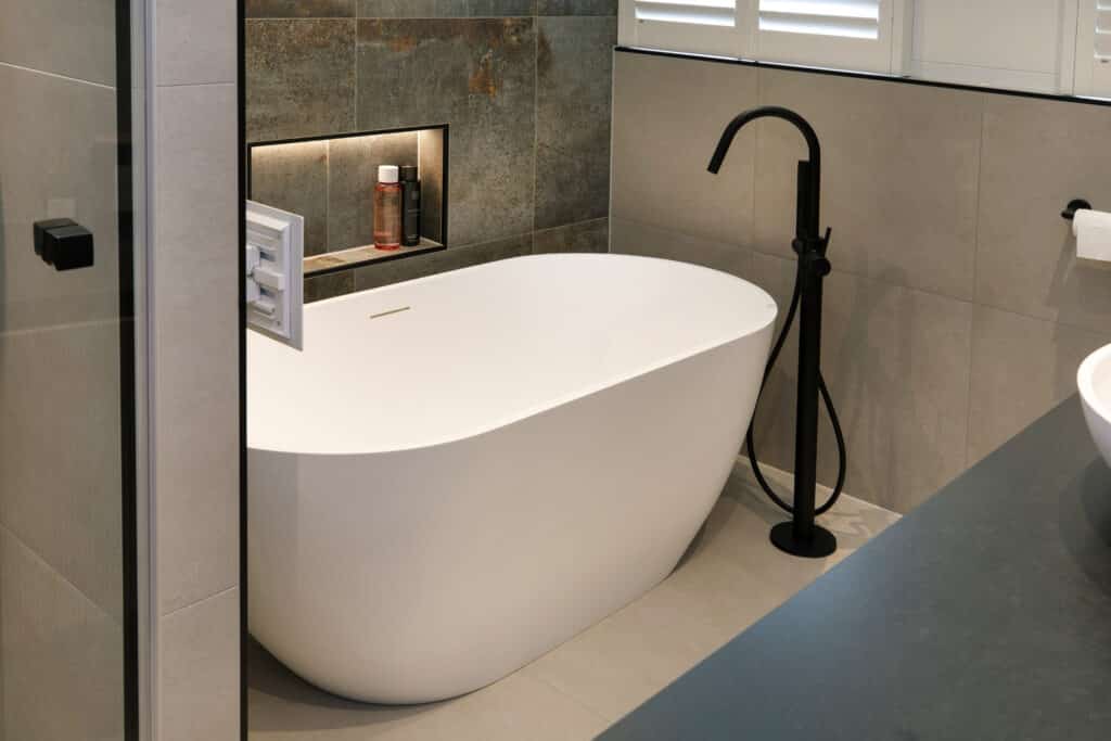 Tegelijkertijd bevat de badkamer elementen uit de industriële stijl, zoals de zwarte accenten en het gebruik van betonlook-tegels.. Deze subtiele industriële touch geeft de badkamer karakter en voorkomt dat het geheel te neutraal wordt.