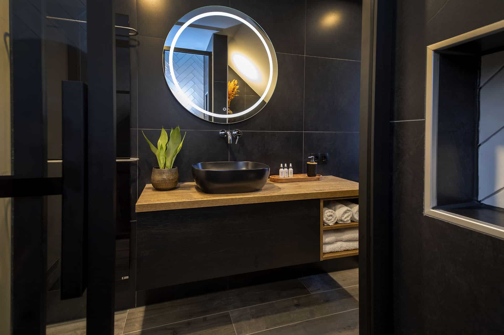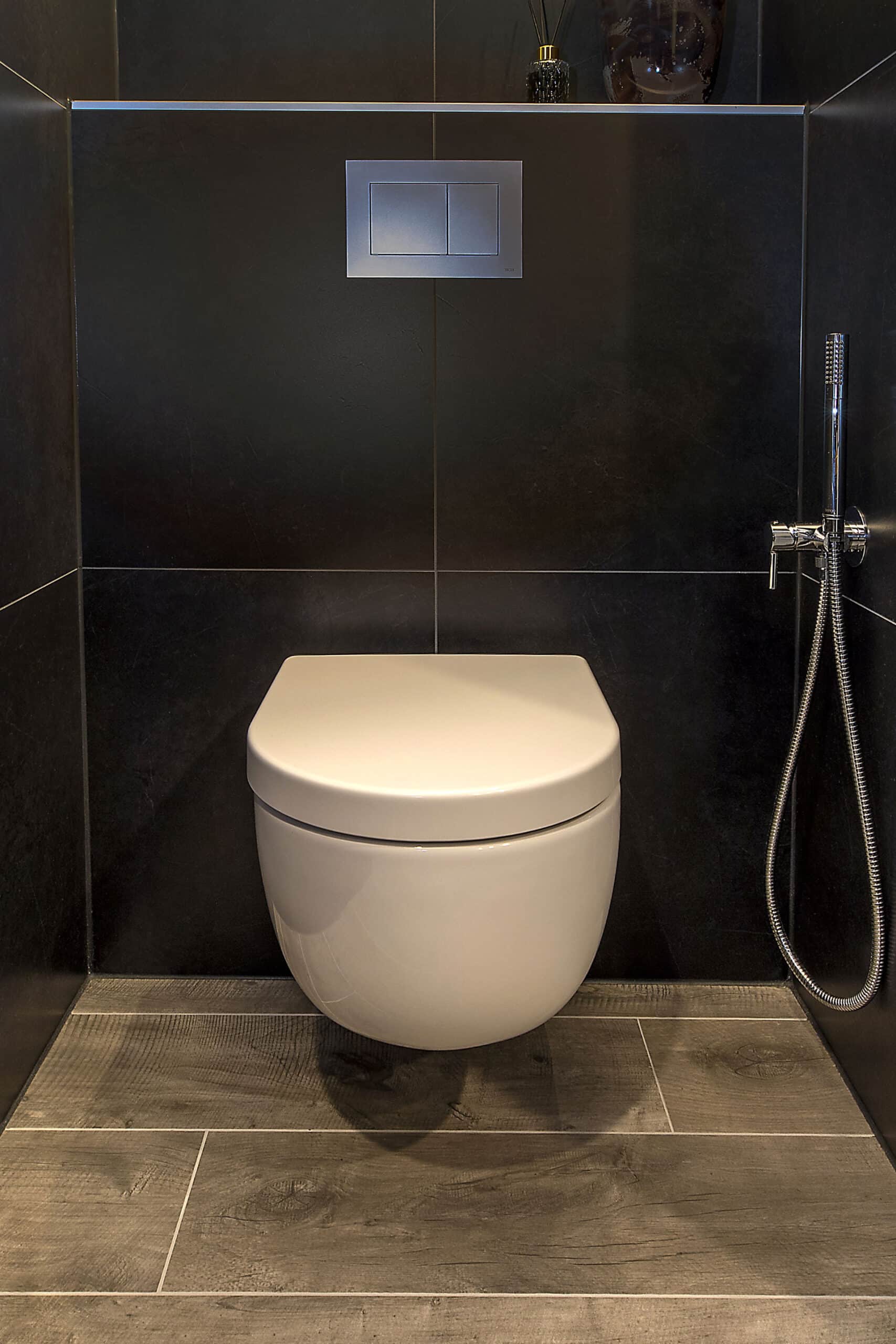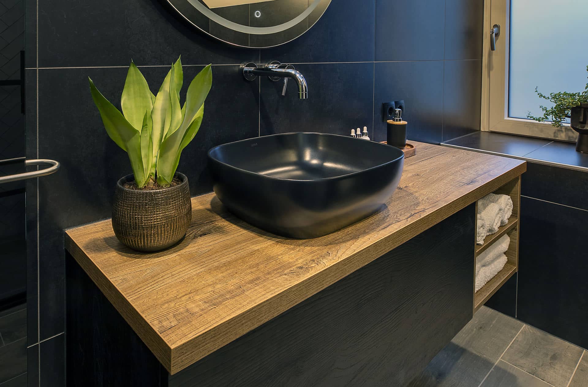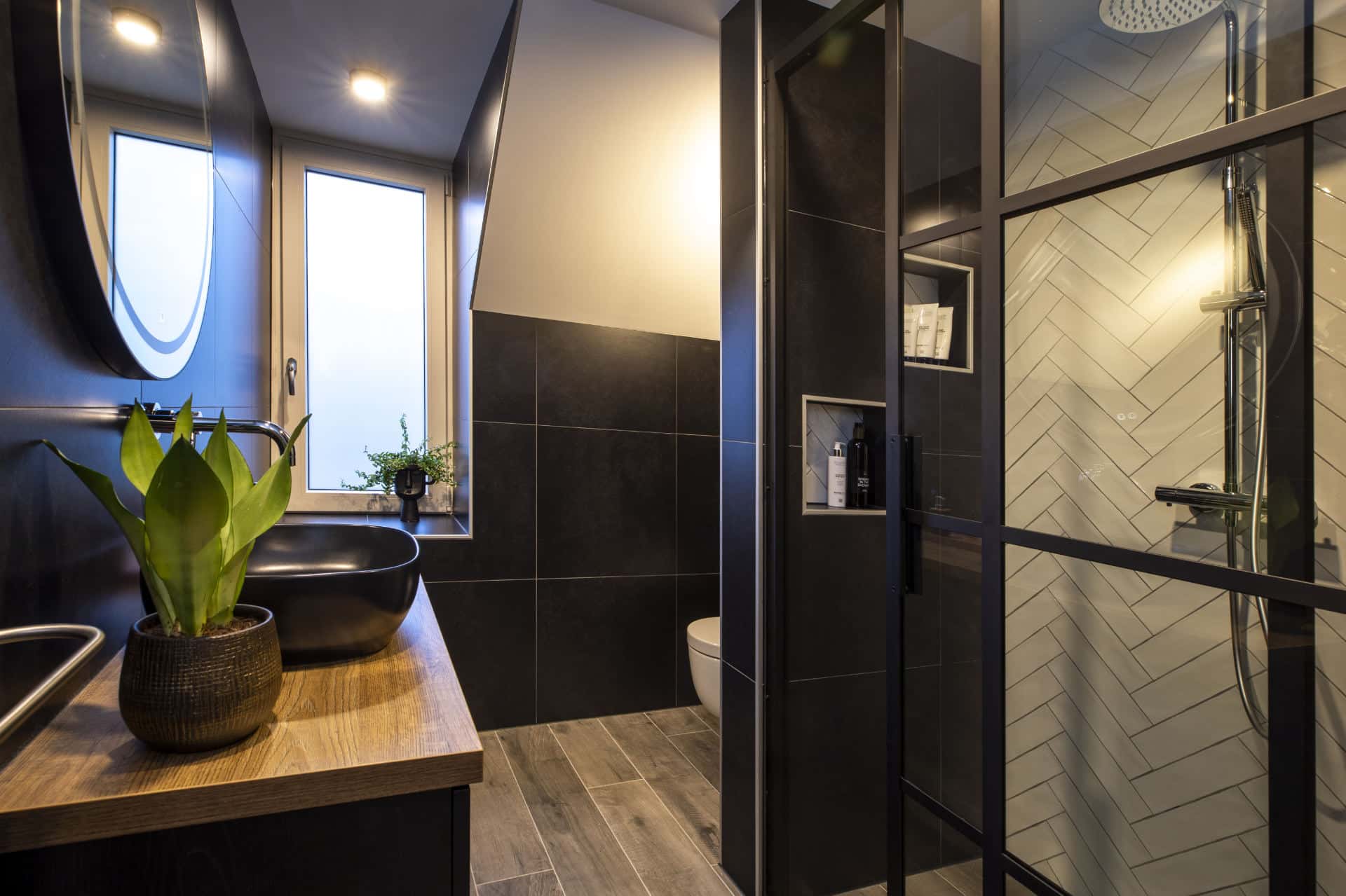 Wat bij het betreden van deze badkamer ongetwijfeld het meest in het oog springt, is de rijke variatie aan donkere tinten. Heeft het interieur hiermee dan een trieste onaantrekkelijke uitstraling gekregen? Zeker niet! De zorgvuldig gekozen donkere kleuren zijn dusdanig op elkaar afgestemd, dat deze badkamer juist een luxe en stoere look heeft gekregen.