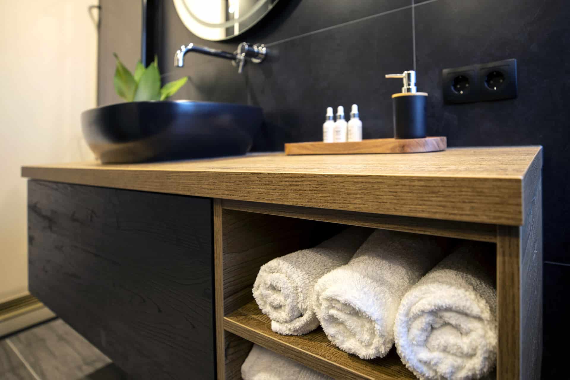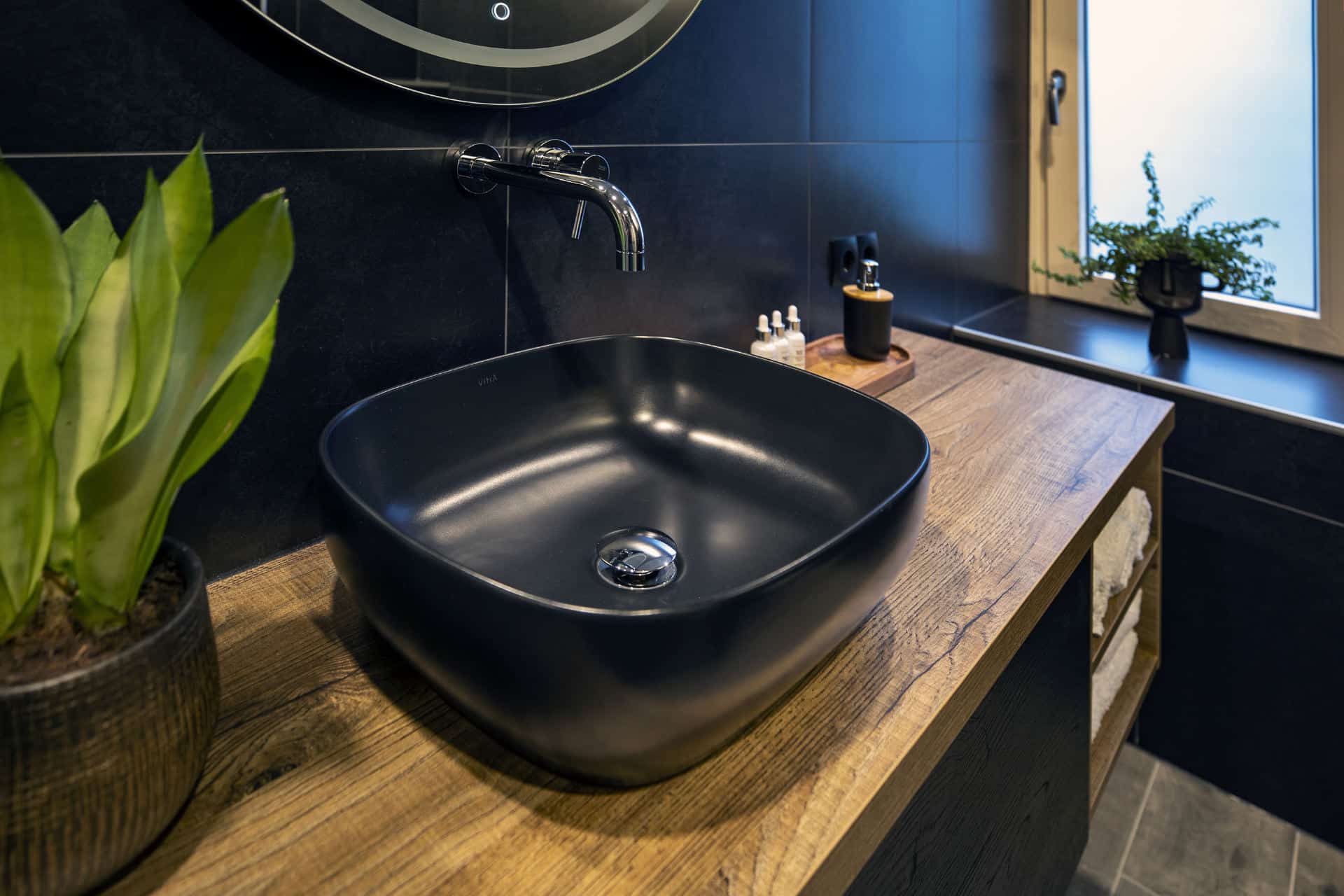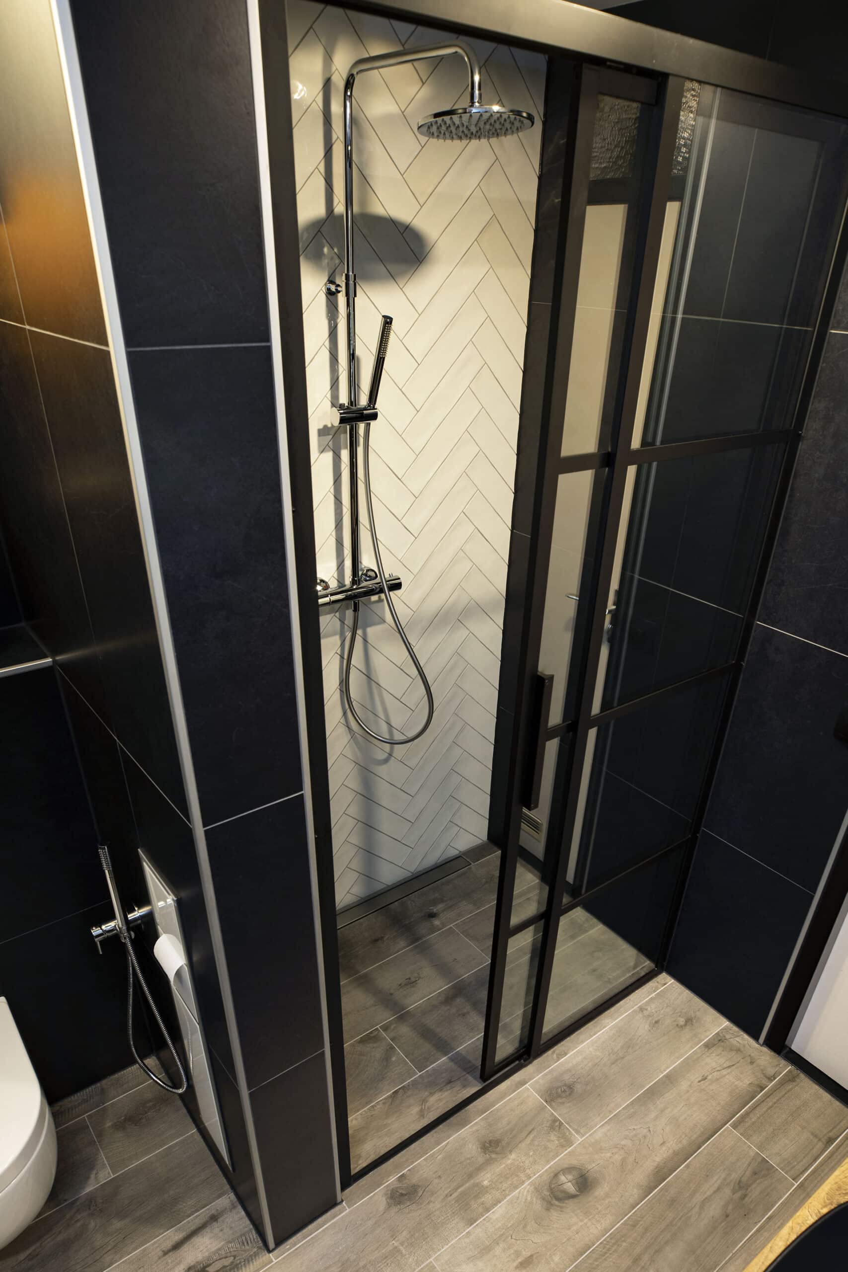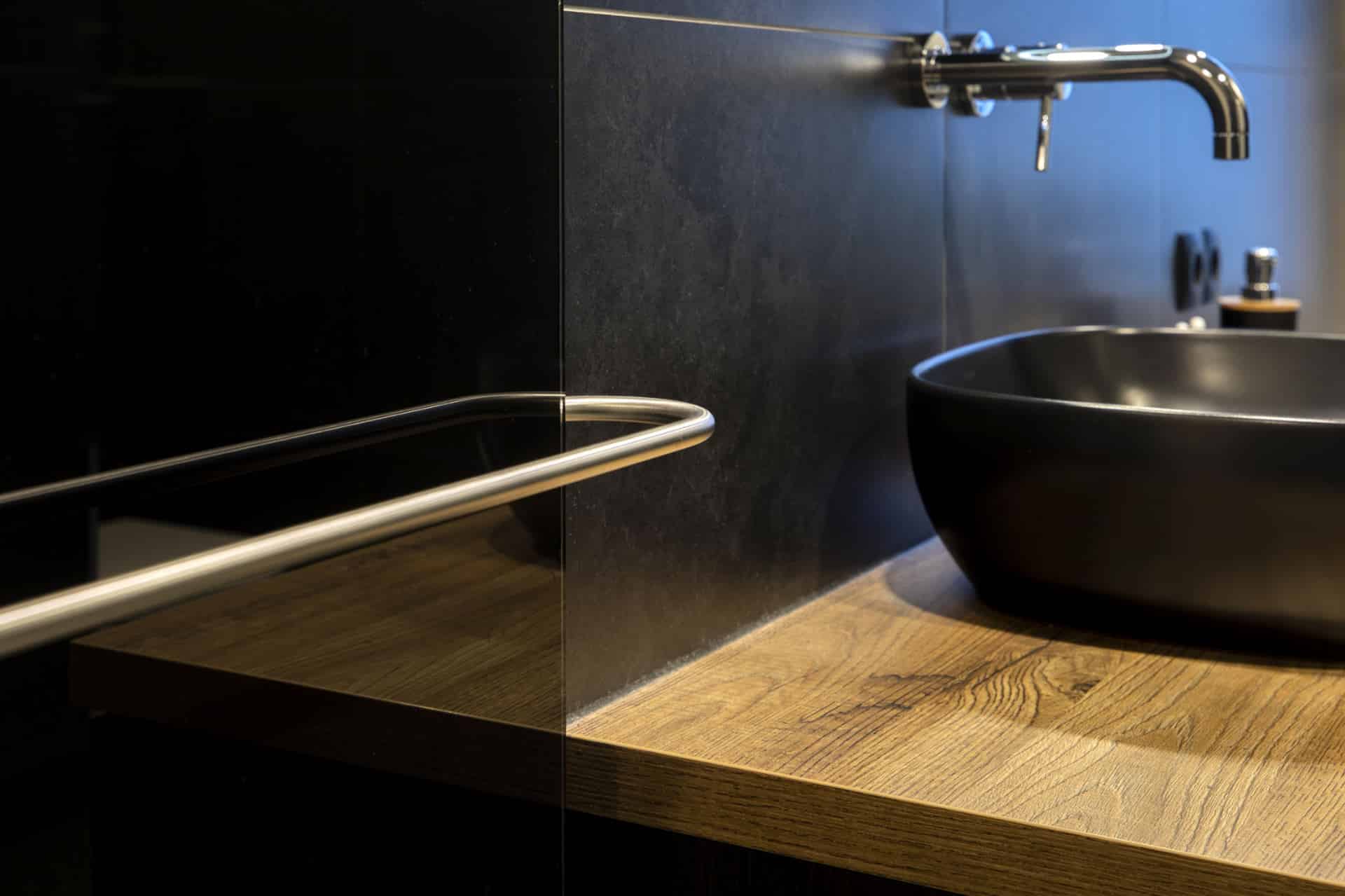 Wat bij het betreden van deze badkamer ongetwijfeld het meest in het oog springt, is de rijke variatie aan donkere tinten. Heeft het interieur hiermee dan een trieste onaantrekkelijke uitstraling gekregen? Zeker niet! De zorgvuldig gekozen donkere kleuren zijn dusdanig op elkaar afgestemd, dat deze badkamer juist een luxe en stoere look heeft gekregen.