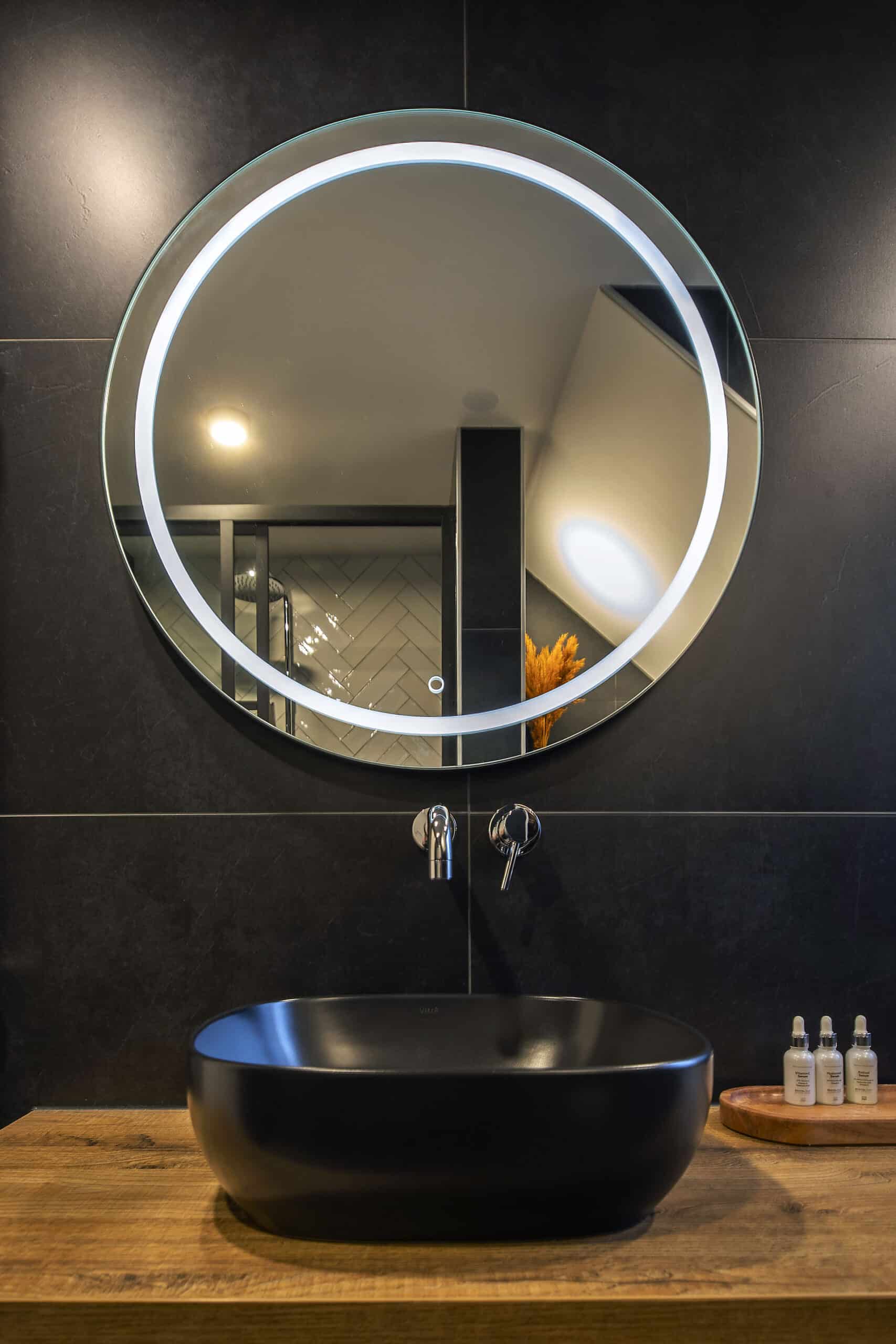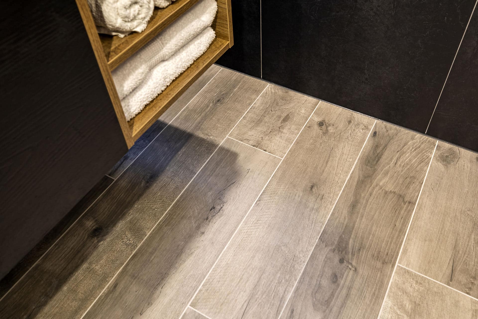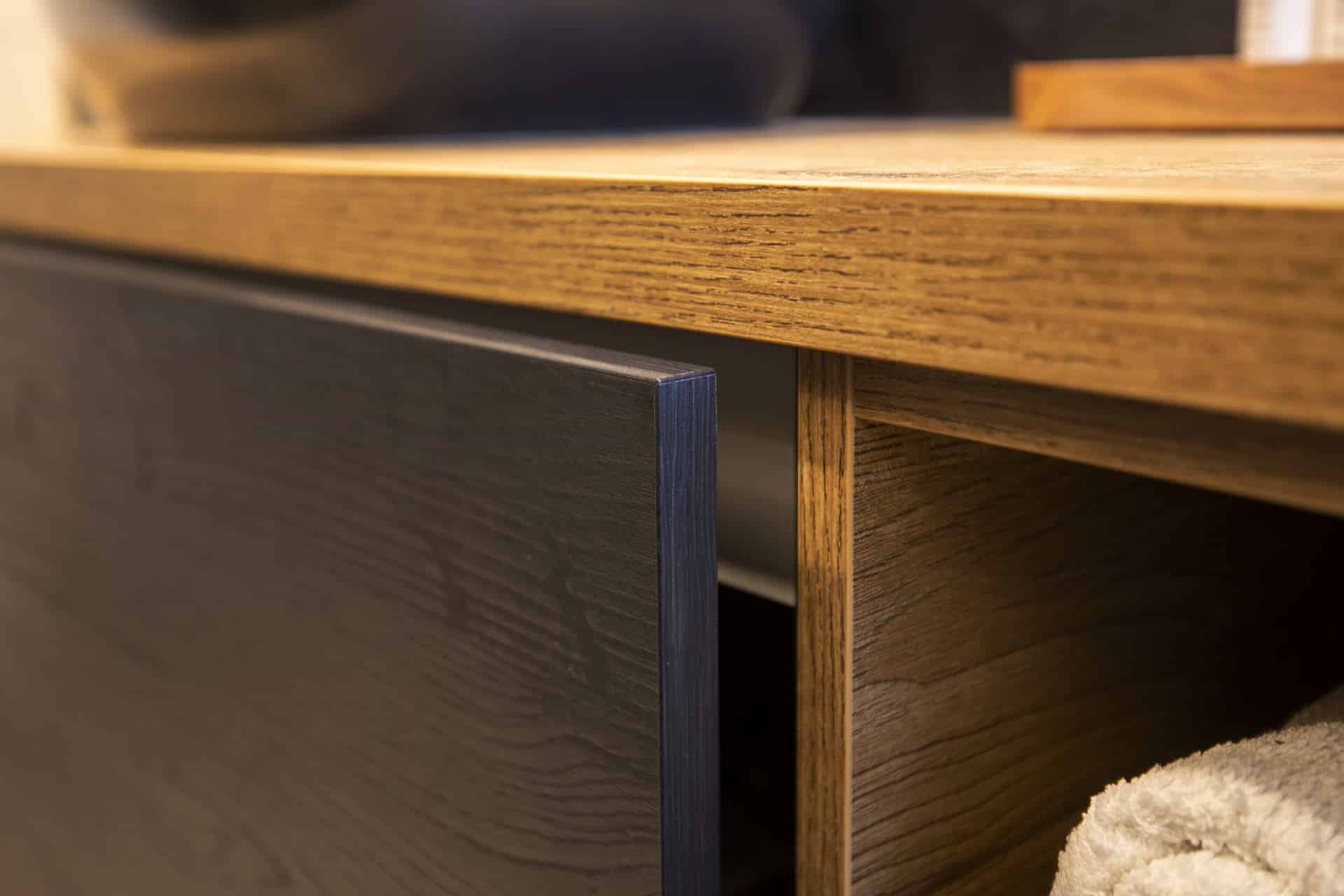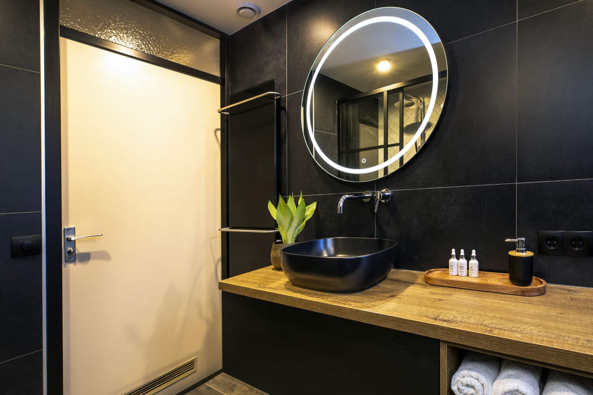 Wat bij het betreden van deze badkamer ongetwijfeld het meest in het oog springt, is de rijke variatie aan donkere tinten. Heeft het interieur hiermee dan een trieste onaantrekkelijke uitstraling gekregen? Zeker niet! De zorgvuldig gekozen donkere kleuren zijn dusdanig op elkaar afgestemd, dat deze badkamer juist een luxe en stoere look heeft gekregen.
