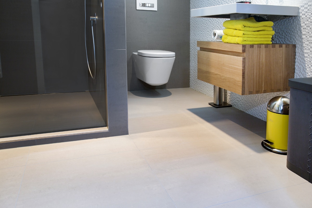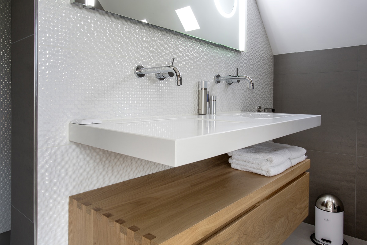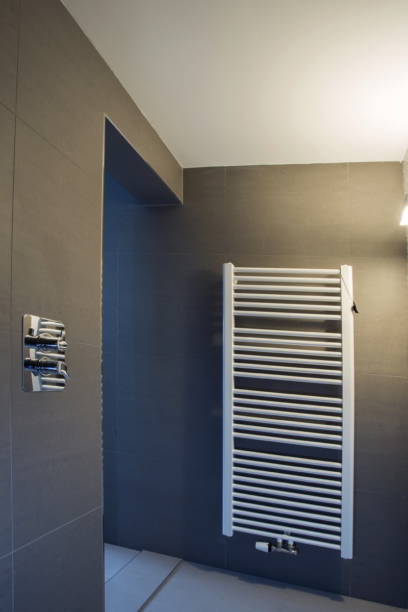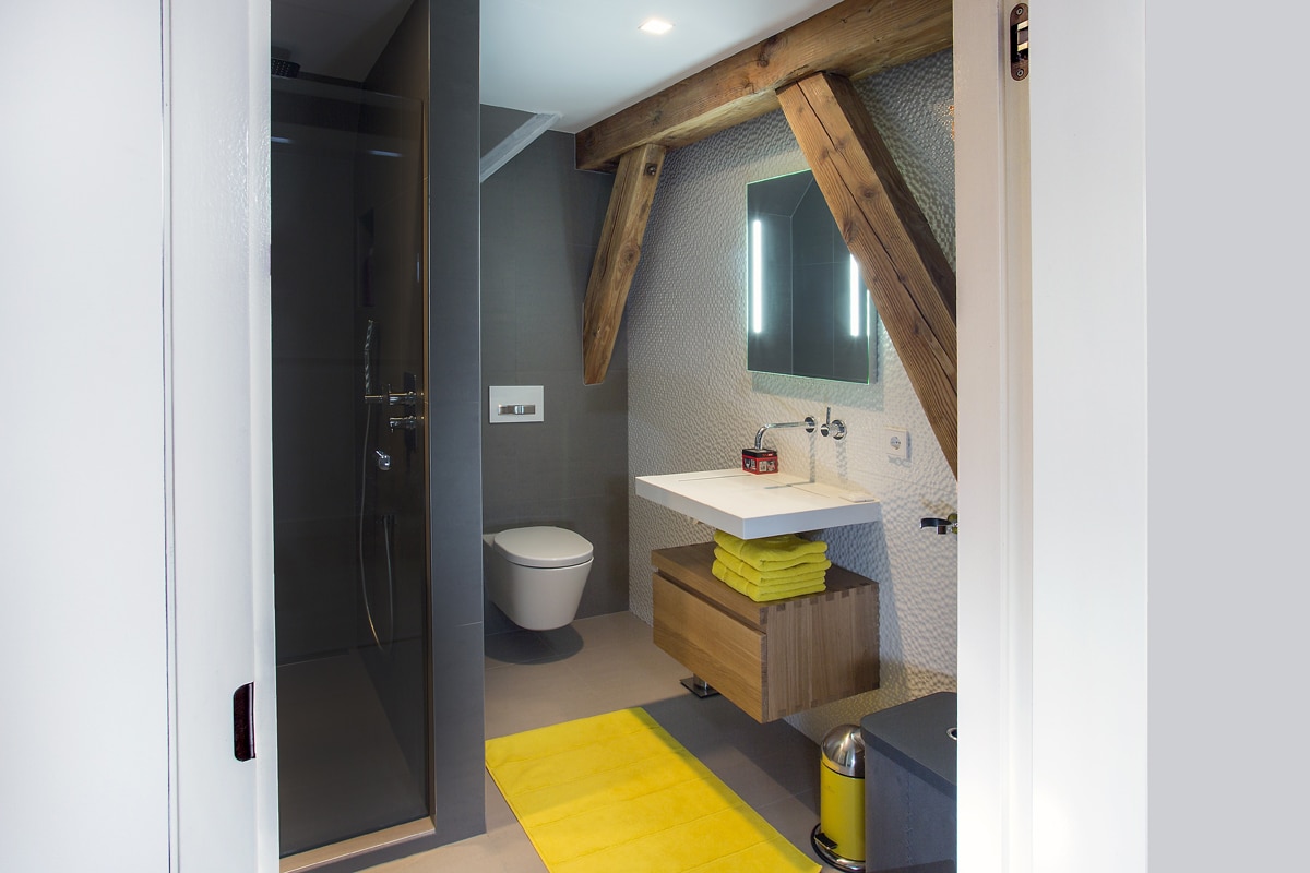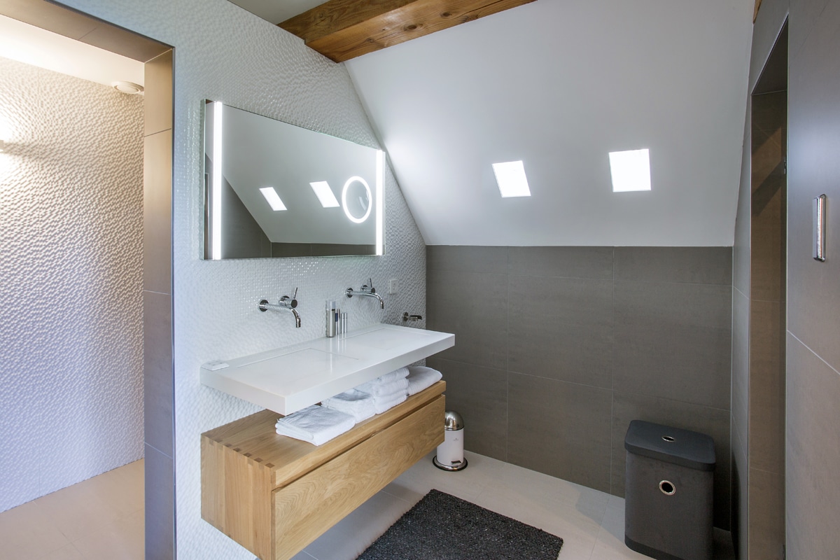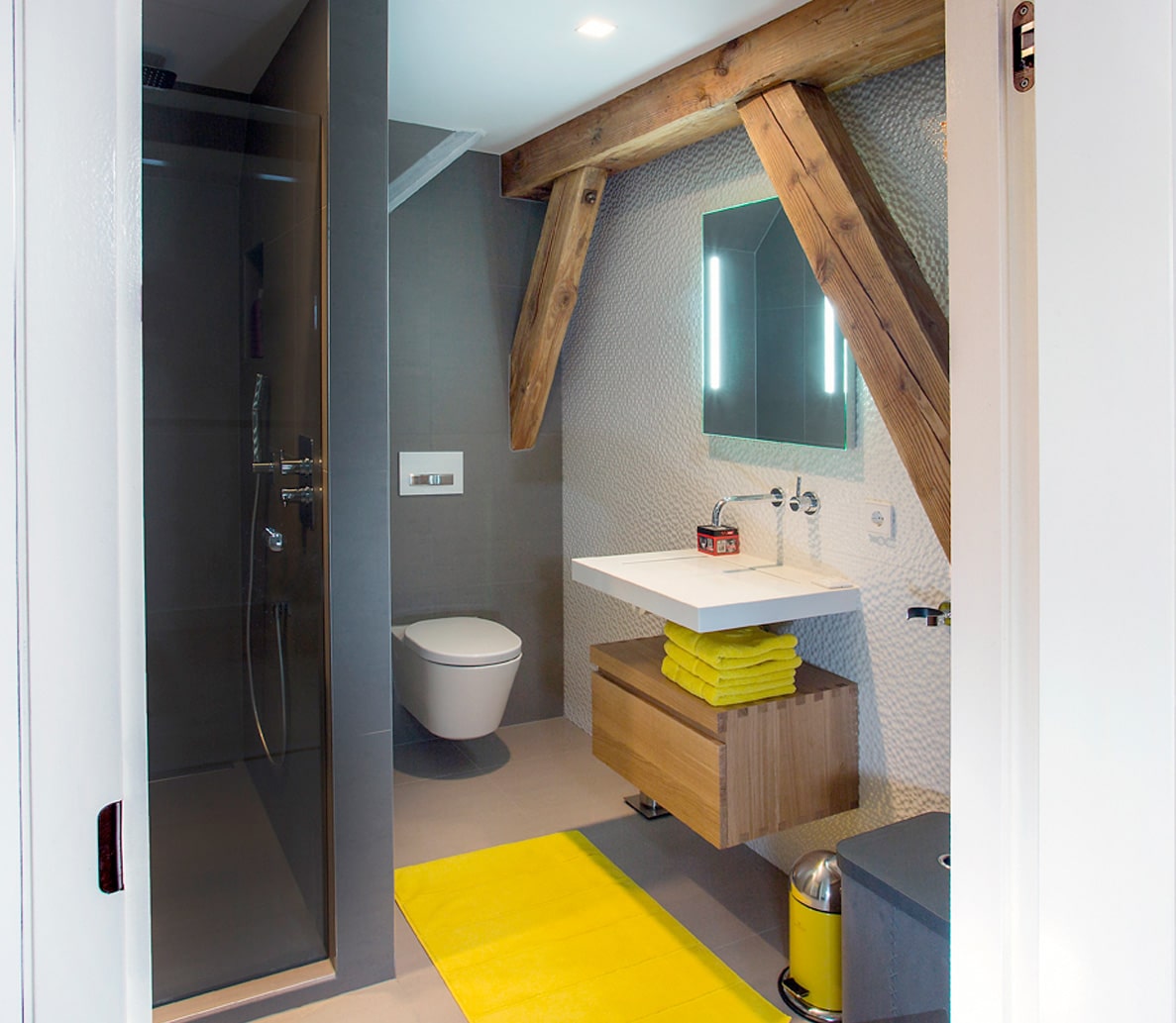 De mooie kleuren zijn opvallend aan deze badkamer. Een warme, donkere aardetint wordt afgewisseld met een lichtere variant op de vloer en een prachtige witte muur. Dit zorgt voor een mooi contrast en creëren een warme ruimte. De authentieke houten balken geven de badkamer dat extra beetje sfeer.