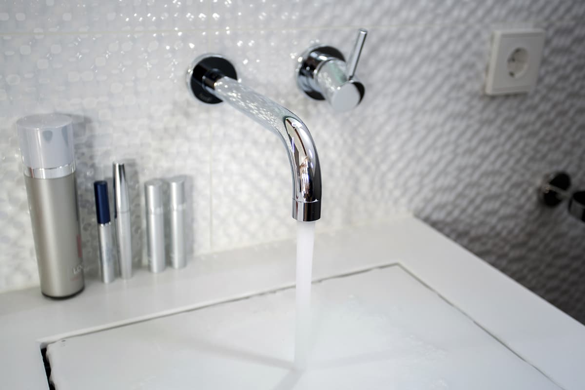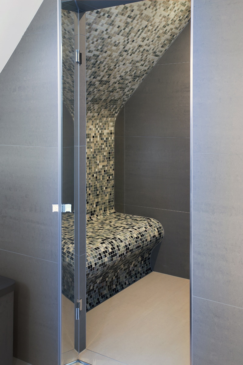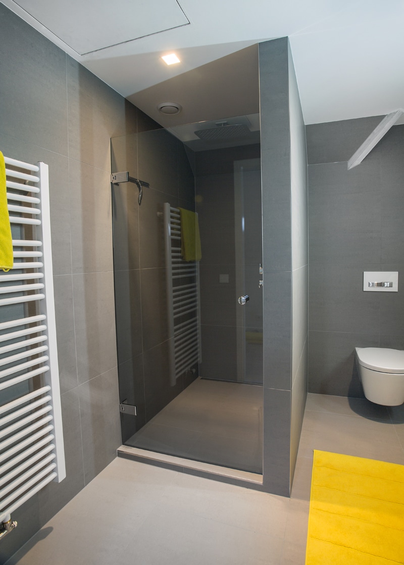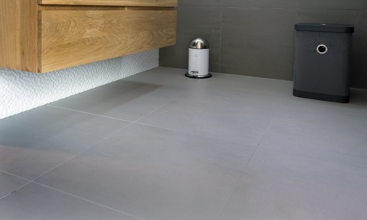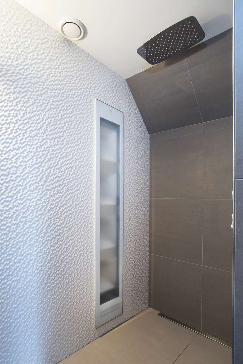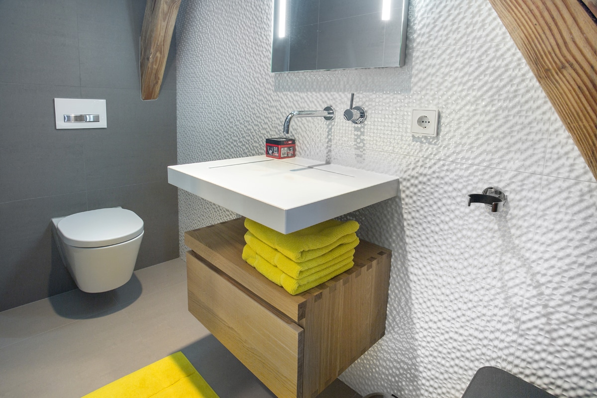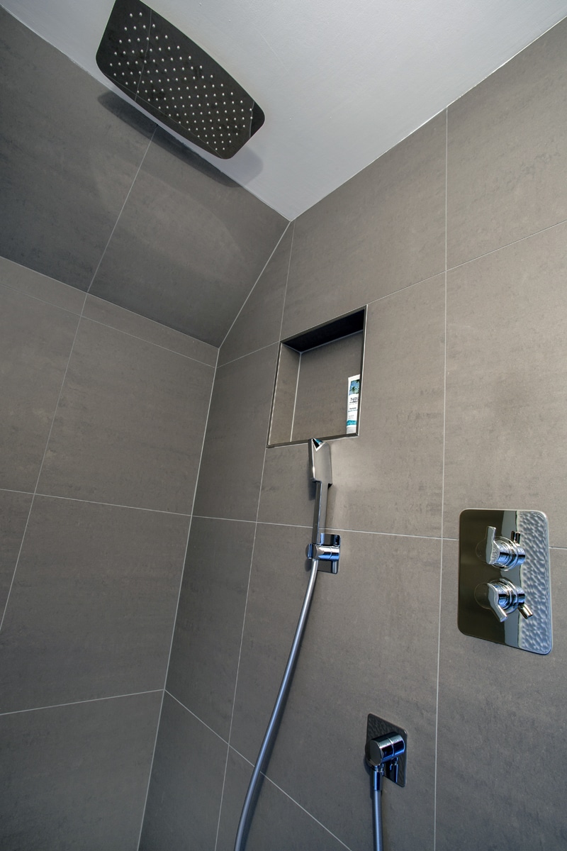 De mooie kleuren zijn opvallend aan deze badkamer. Een warme, donkere aardetint wordt afgewisseld met een lichtere variant op de vloer en een prachtige witte muur. Dit zorgt voor een mooi contrast en creëren een warme ruimte. De authentieke houten balken geven de badkamer dat extra beetje sfeer.