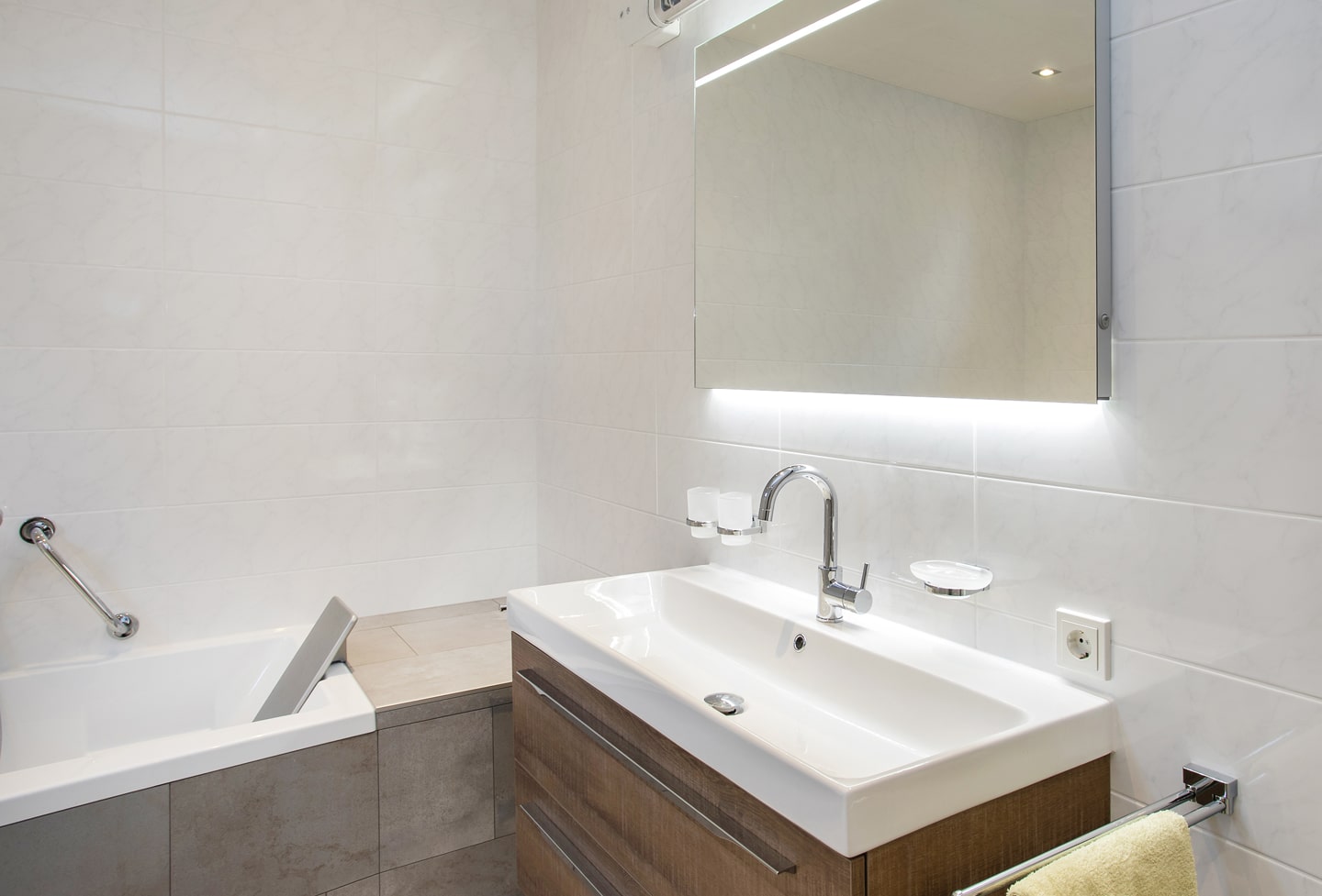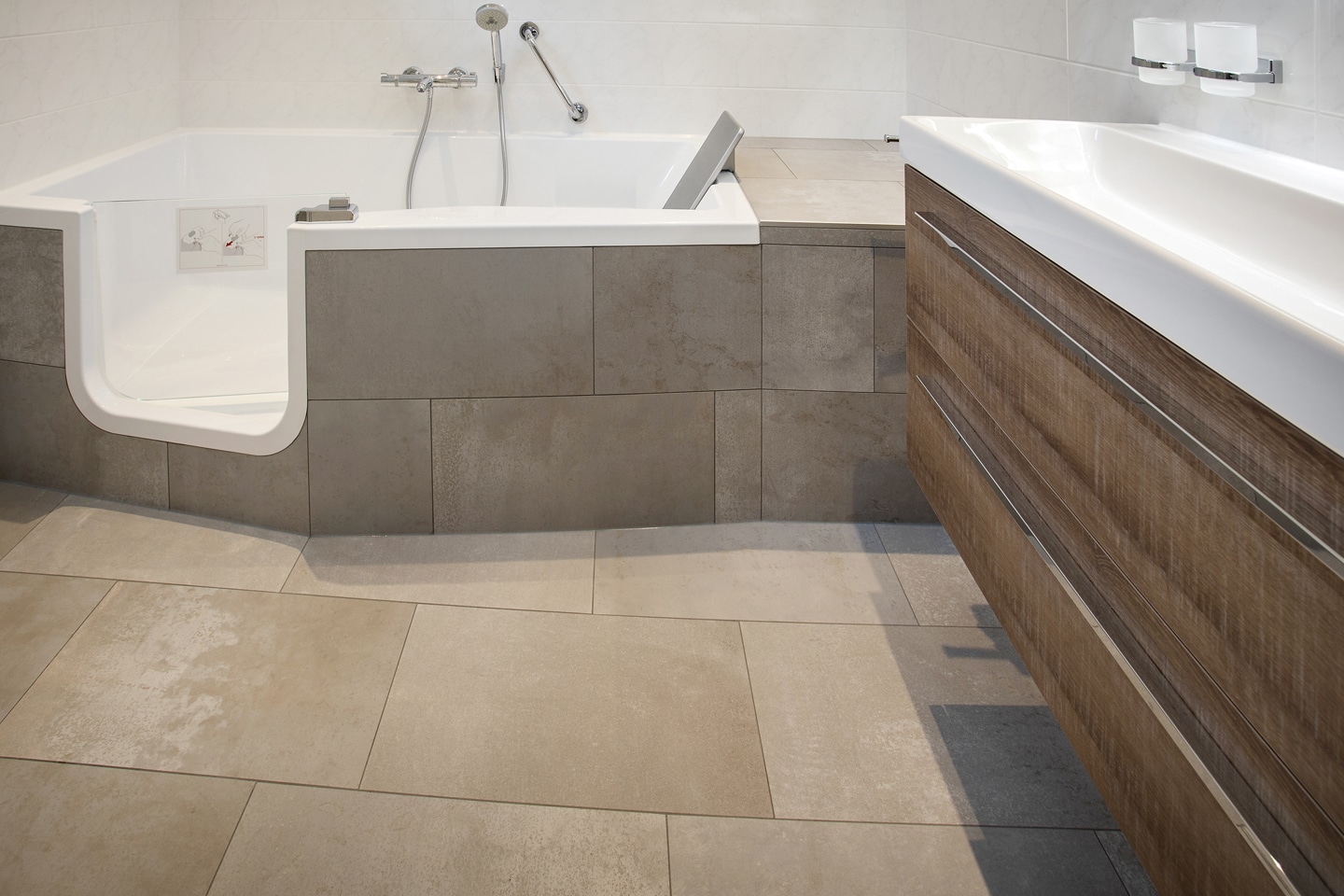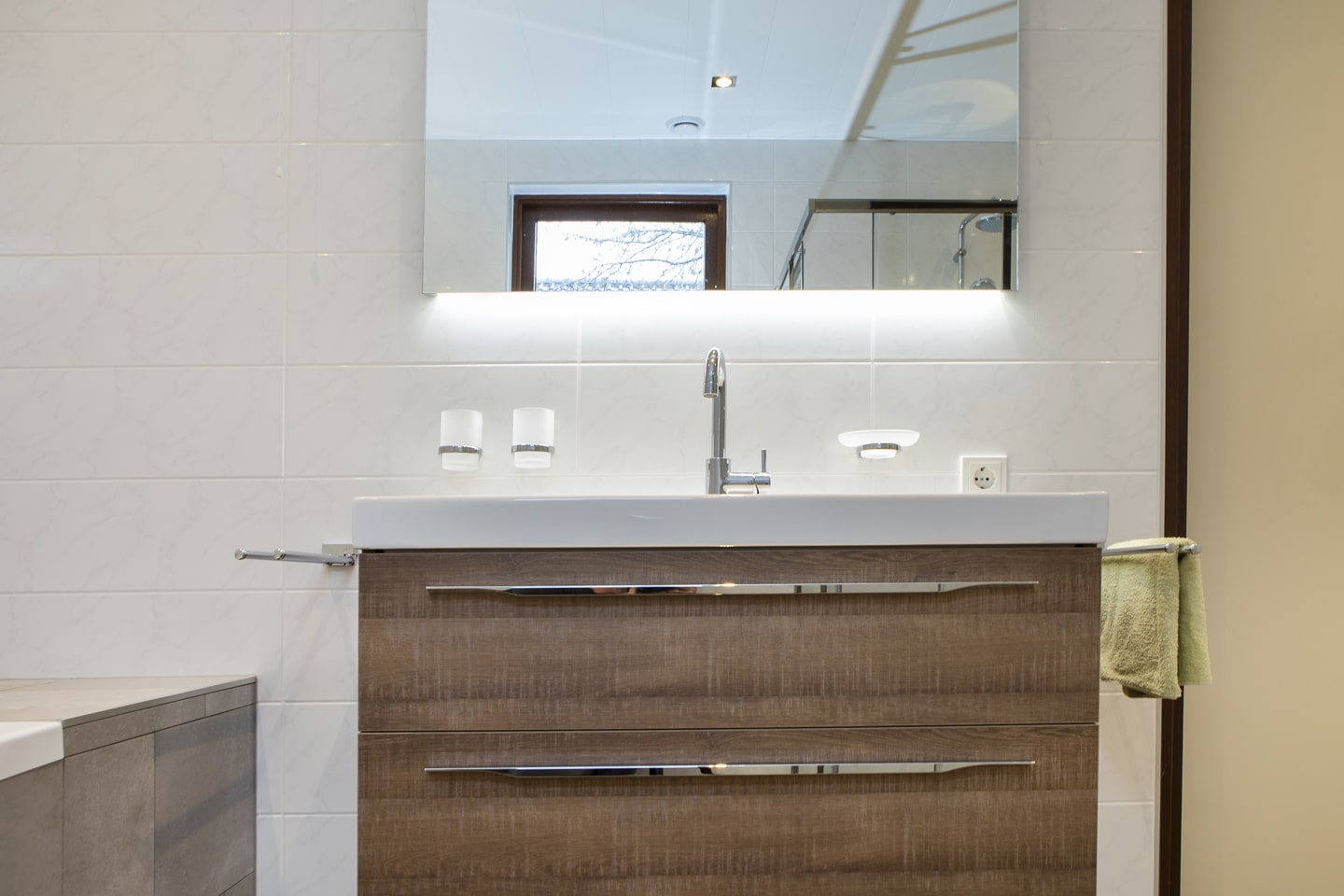 Centraal in deze prachtige badkamer staat de combinatie tussen specialistisch tegelwerk, gebruiksvriendelijke onderdelen en licht. De kleurencombinaties die gevormd worden door de tegelvloer, de houten wastafelkast en de lichte tegelwanden geven een strak en warme indruk. Het design is volledig ontwikkeld met oog voor de gebruiker die hierin centraal staat.