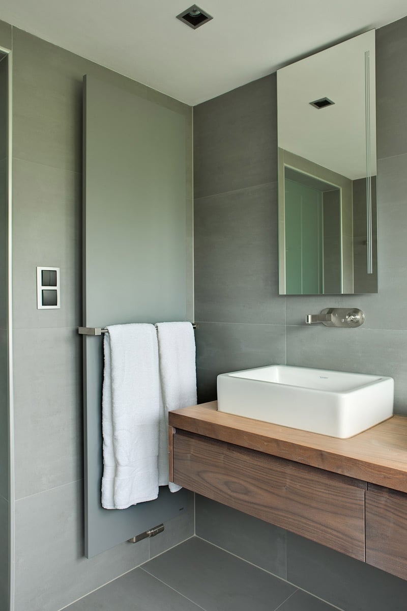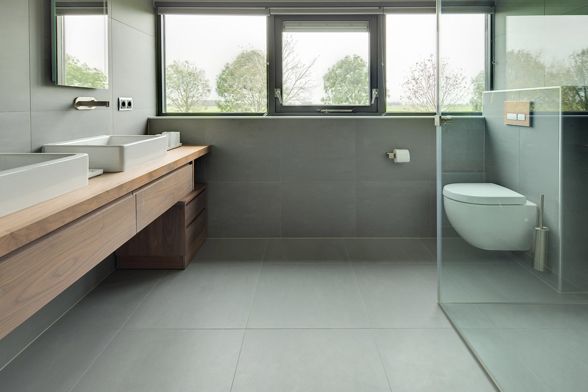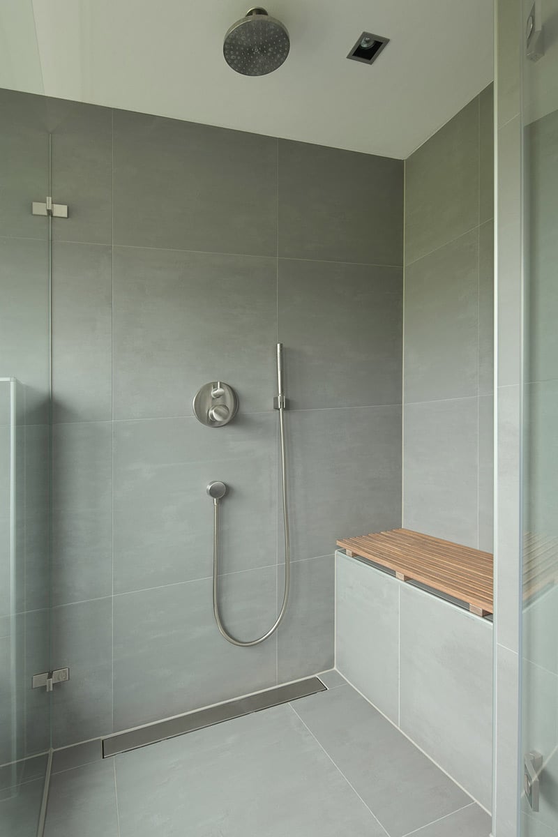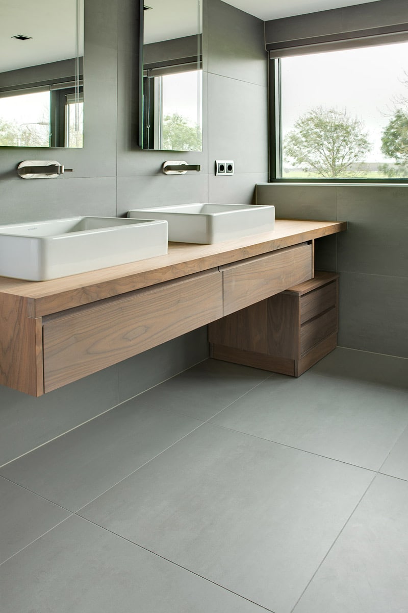 De strakke tegels op de wanden en vloer zijn van Mosa. Er is gekozen voor grijze tegels in een groot formaat. Dit combineert prachtig met de houten badkamermeubels, de glazen douchewand en het witte sanitair met RVS details.