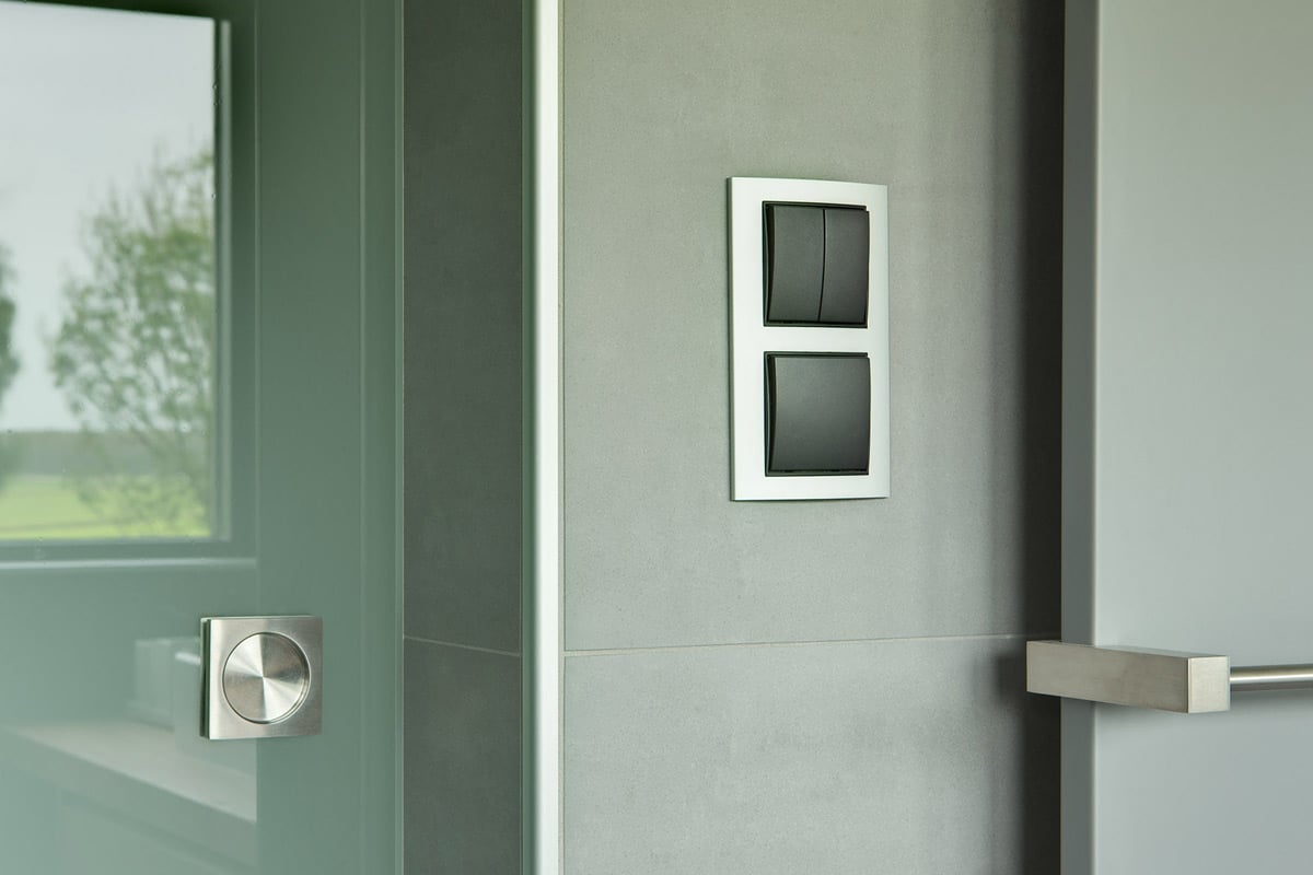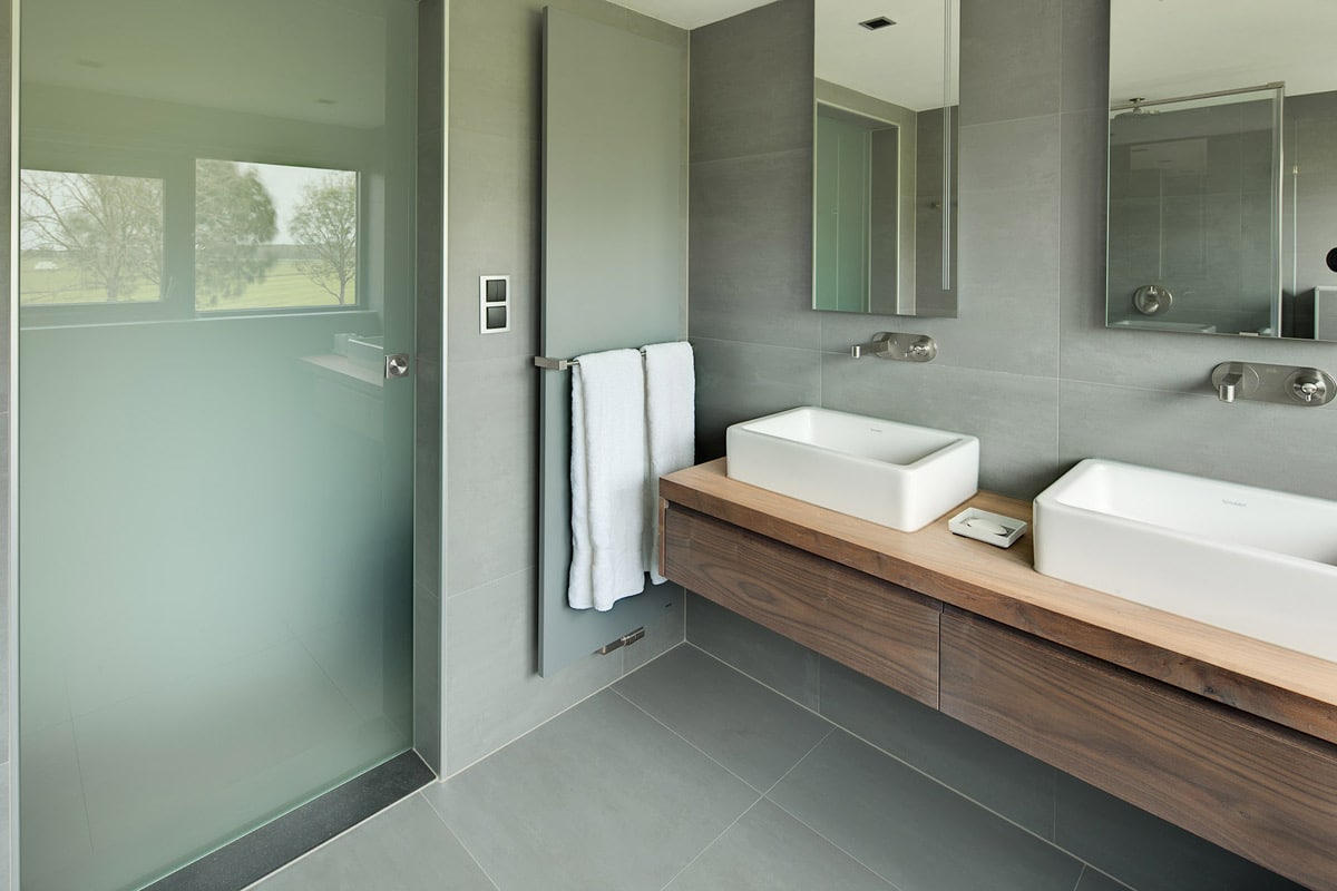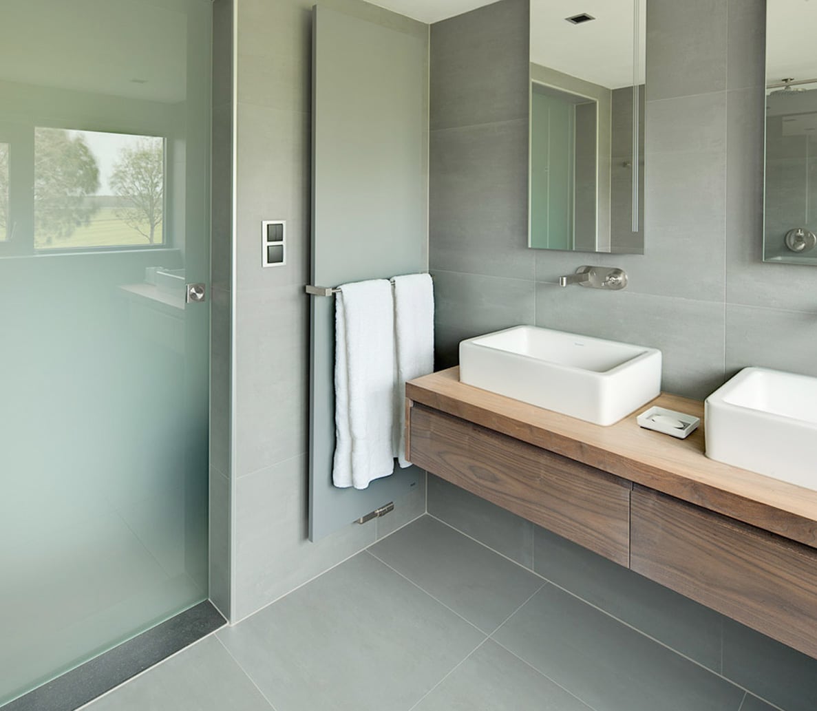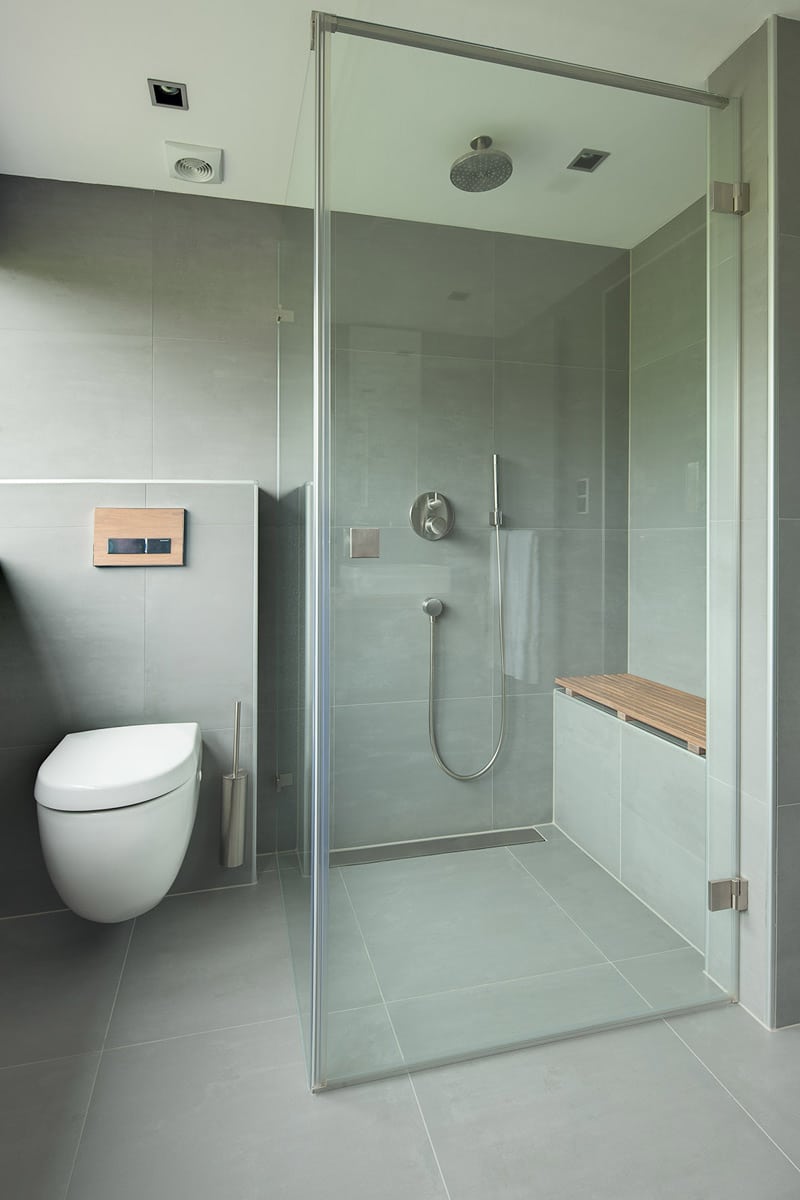 De strakke tegels op de wanden en vloer zijn van Mosa. Er is gekozen voor grijze tegels in een groot formaat. Dit combineert prachtig met de houten badkamermeubels, de glazen douchewand en het witte sanitair met RVS details.