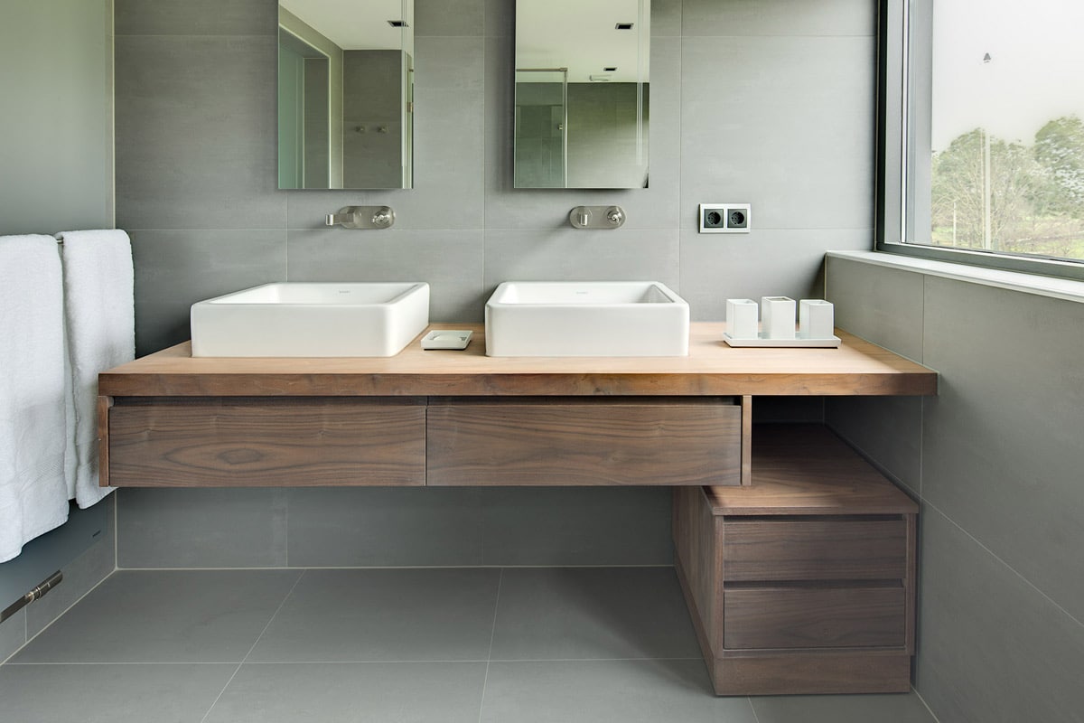 De greeploze badkamermeubels zijn ontworpen en gemaakt door Custom Made De Jong. Het grote voordeel van badkamermeubels op maat? Het materiaal, de kleur, afmetingen en budget stemmen we volledig af op uw wensen. In deze badkamer is gekozen voor houten badkamermeubels. Door hout in uw badkamer te verwerken, ontstaat er een warme en natuurlijke uitstraling.
