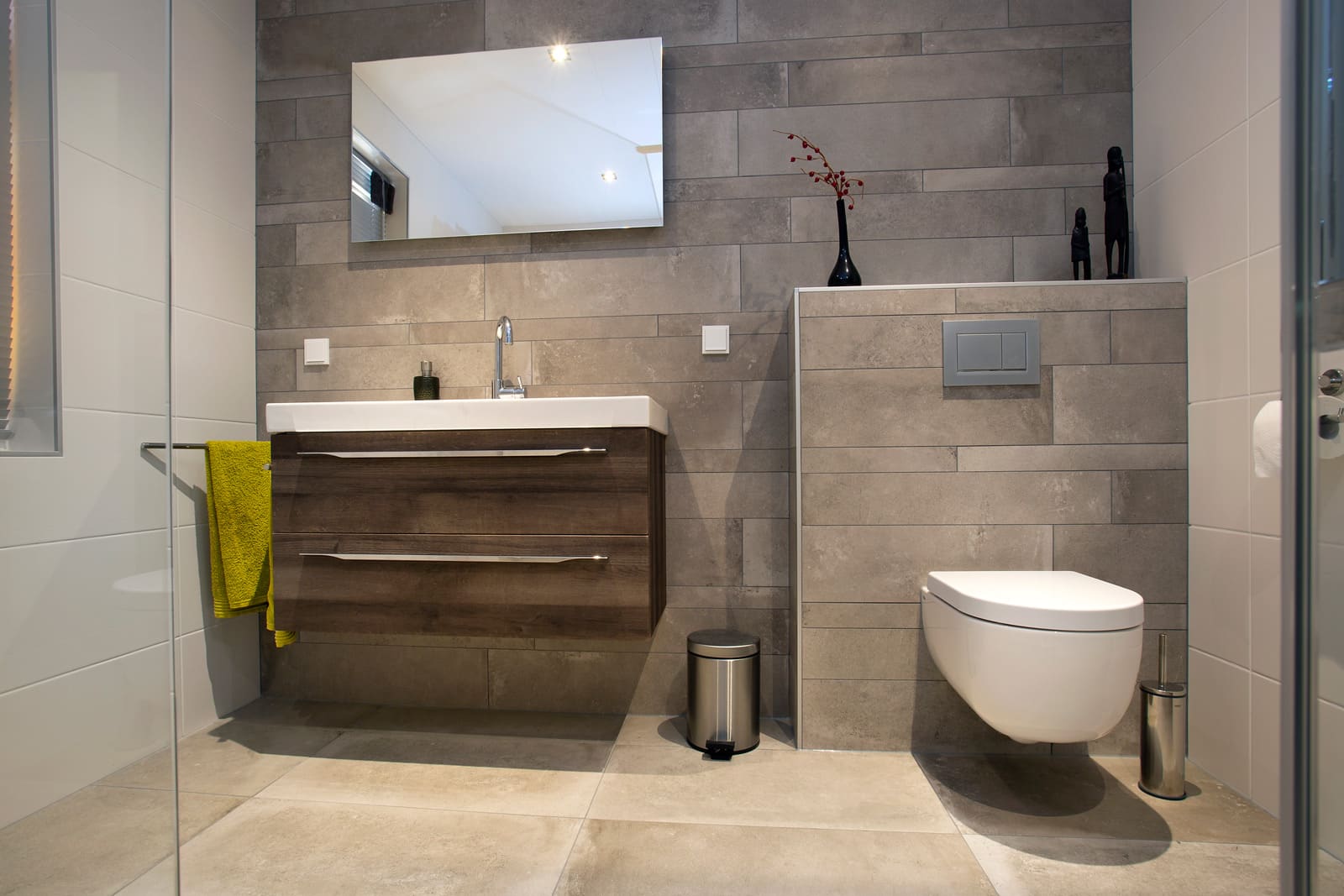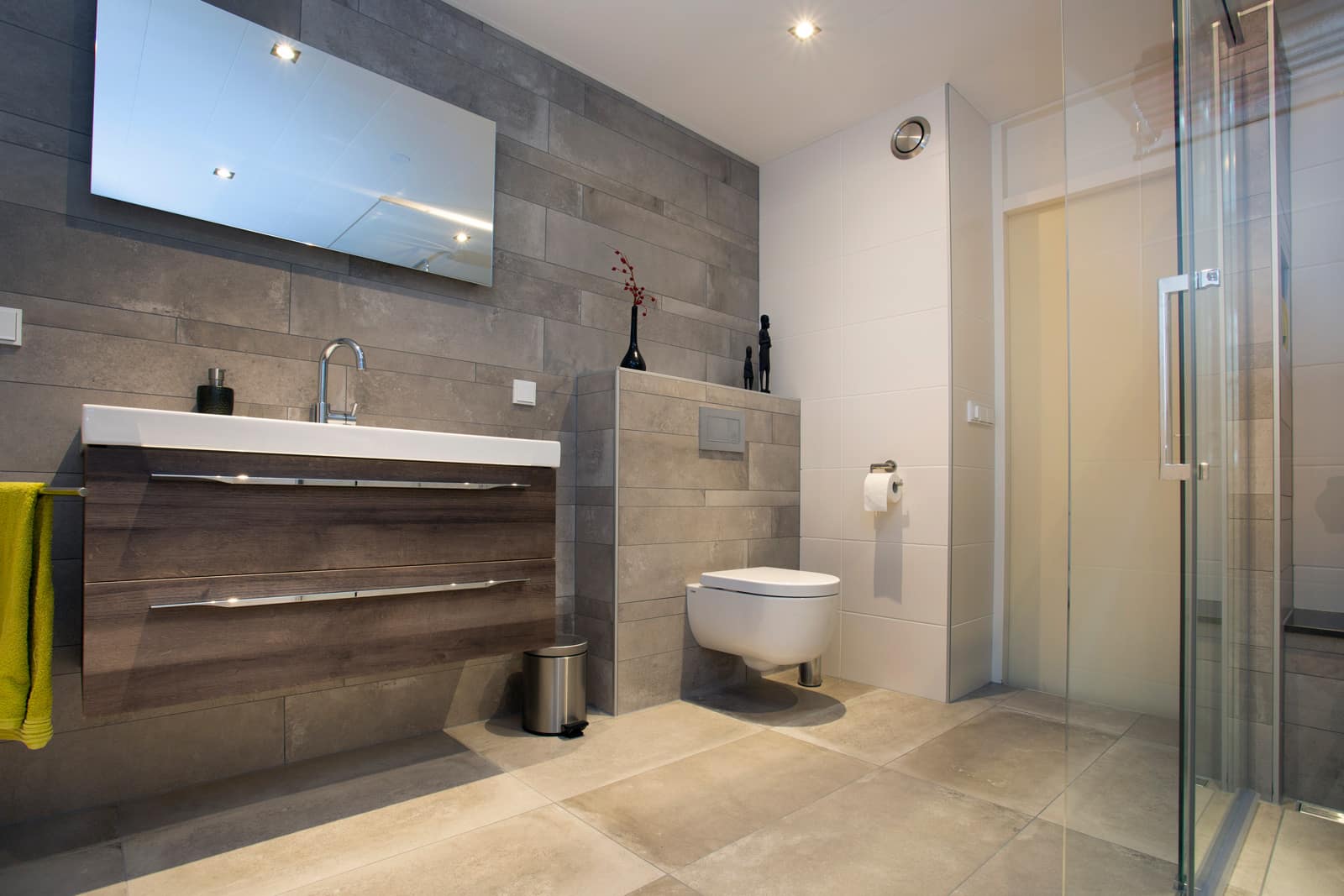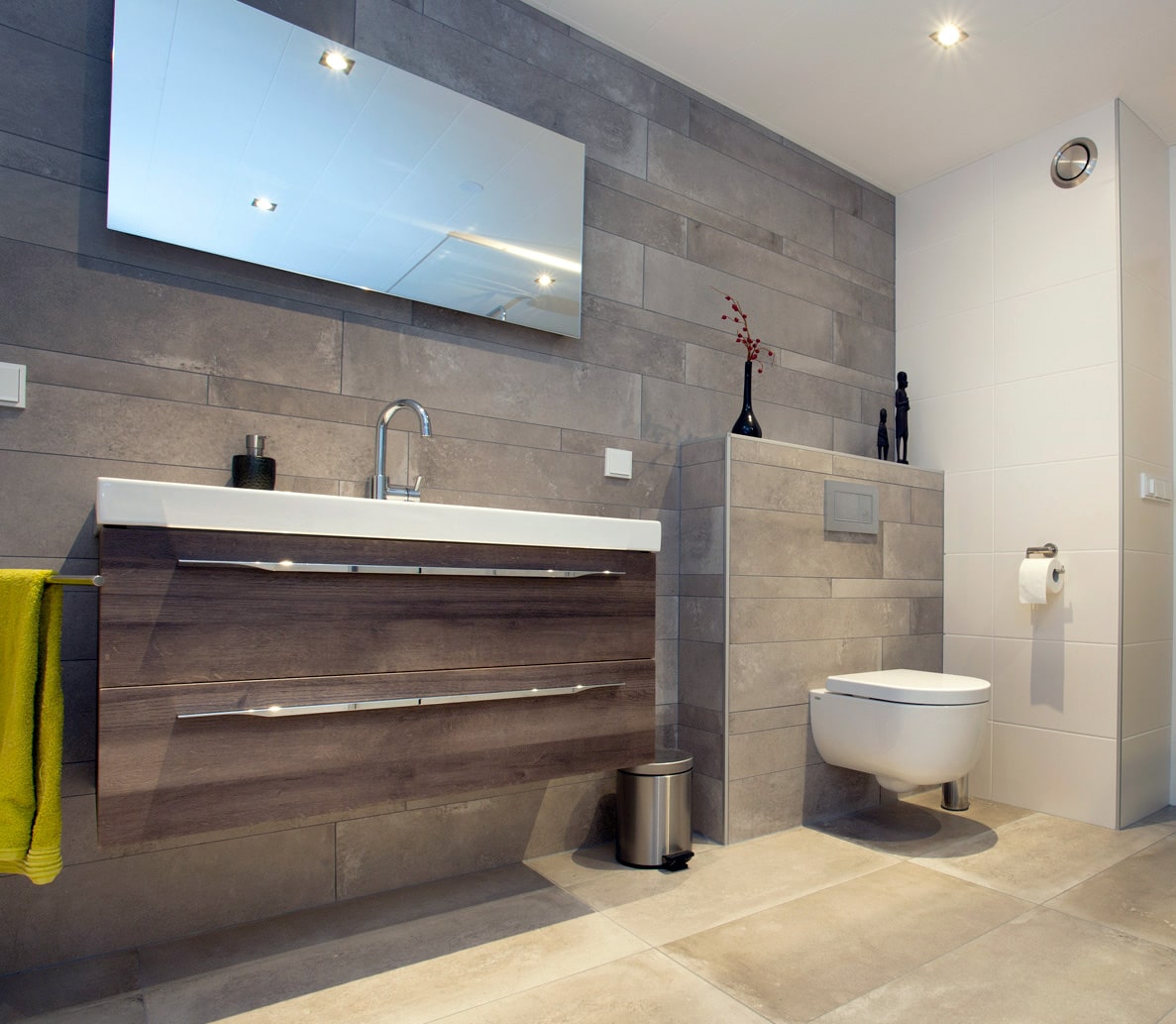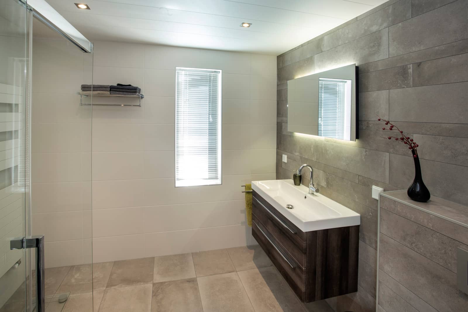 Wat bij binnenkomst opvalt aan deze gerenoveerde badkamer is de diversiteit aan texturen. Zo vormen karakteristieke natuurstenen vloer- en wandtegels een krachtig contrast met strakke ‘levend-witte’ wandtegels. Wat bij de betegeling in deze badkamer eveneens in het oog springt zijn de verschillende afmetingen en vormen van de tegels. Bepaalde wanddelen lijken wel in wildverband “gemetseld” te zijn. Mede dankzij deze zorgvuldig gekozen variatie krijgt deze badkamer een landelijke, tijdloze uitstraling.