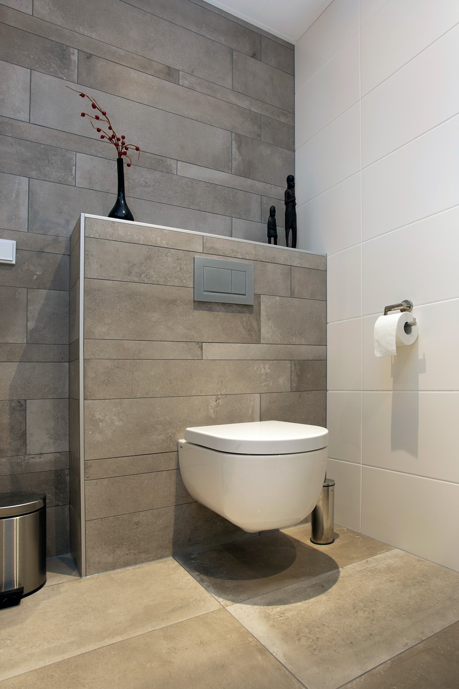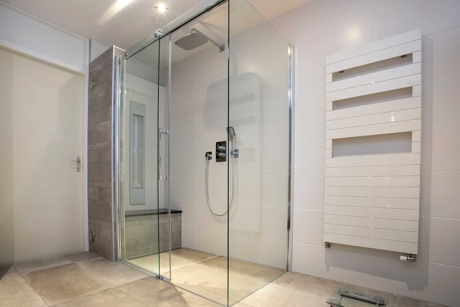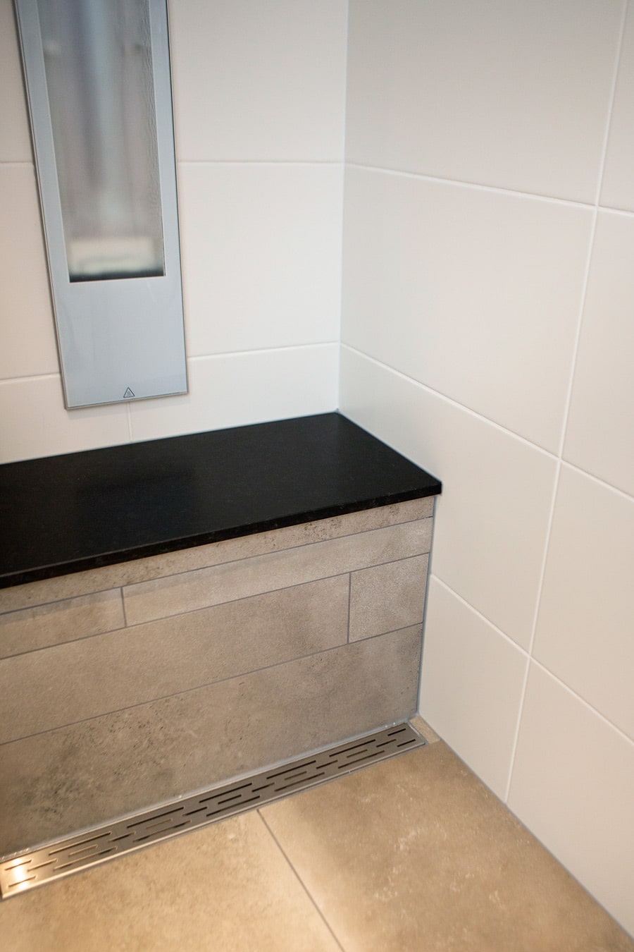 Wat bij binnenkomst opvalt aan deze gerenoveerde badkamer is de diversiteit aan texturen. Zo vormen karakteristieke natuurstenen vloer- en wandtegels een krachtig contrast met strakke ‘levend-witte’ wandtegels. Wat bij de betegeling in deze badkamer eveneens in het oog springt zijn de verschillende afmetingen en vormen van de tegels. Bepaalde wanddelen lijken wel in wildverband “gemetseld” te zijn. Mede dankzij deze zorgvuldig gekozen variatie krijgt deze badkamer een landelijke, tijdloze uitstraling.