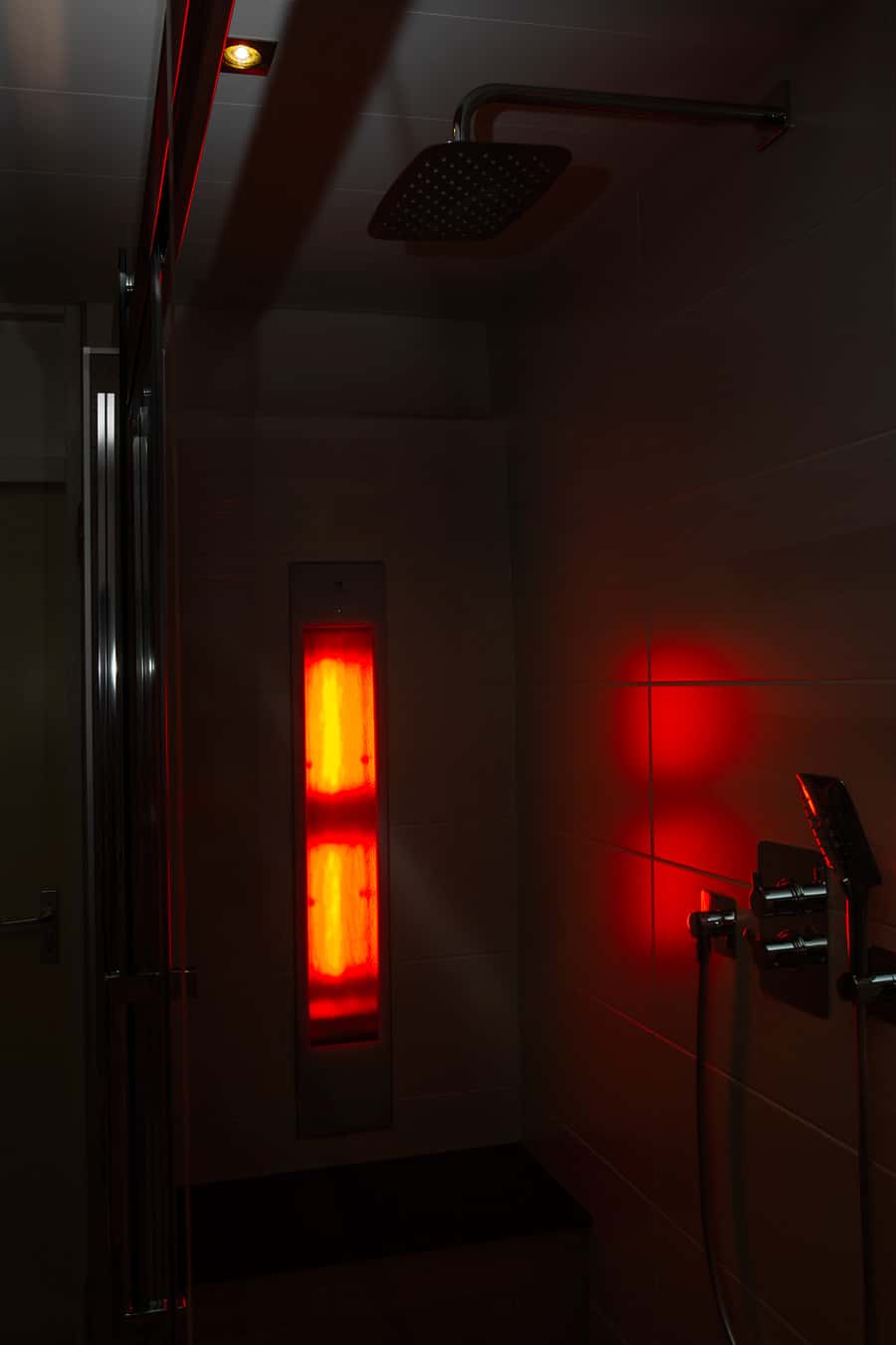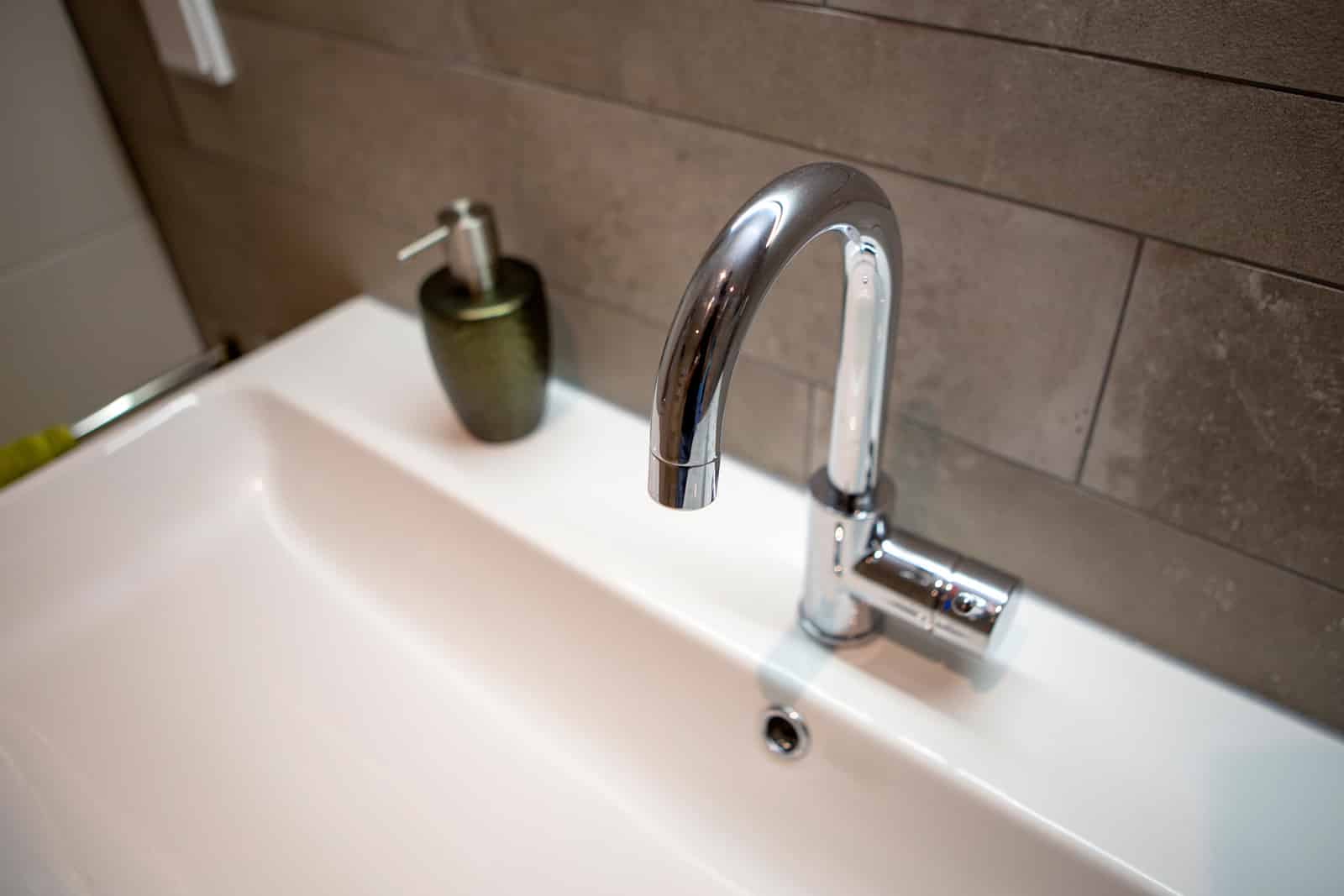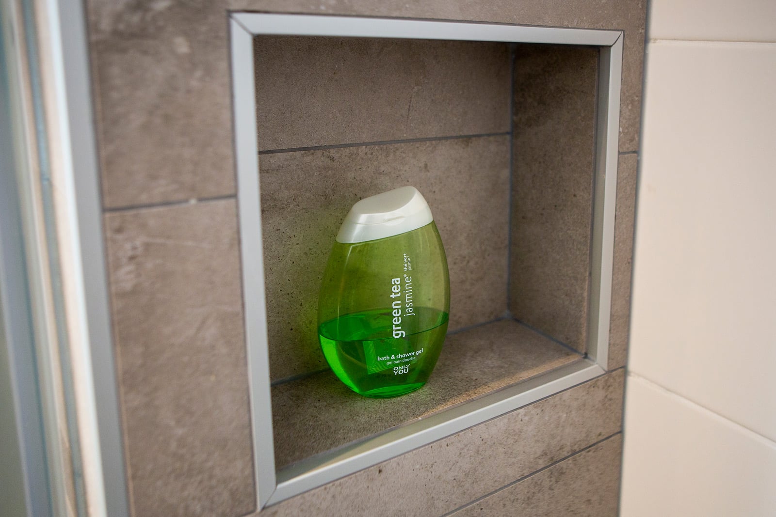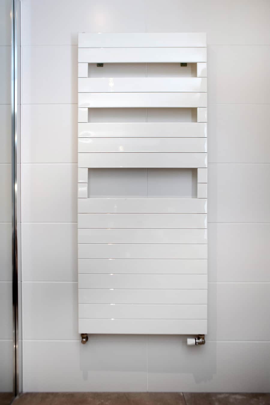 Wat bij binnenkomst opvalt aan deze gerenoveerde badkamer is de diversiteit aan texturen. Zo vormen karakteristieke natuurstenen vloer- en wandtegels een krachtig contrast met strakke ‘levend-witte’ wandtegels. Wat bij de betegeling in deze badkamer eveneens in het oog springt zijn de verschillende afmetingen en vormen van de tegels. Bepaalde wanddelen lijken wel in wildverband “gemetseld” te zijn. Mede dankzij deze zorgvuldig gekozen variatie krijgt deze badkamer een landelijke, tijdloze uitstraling.