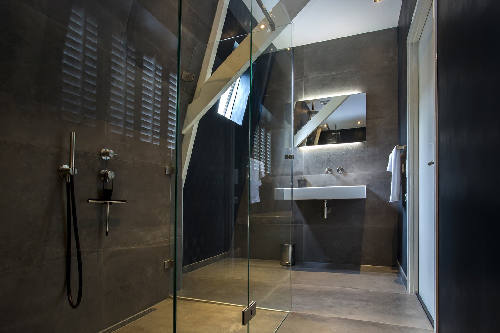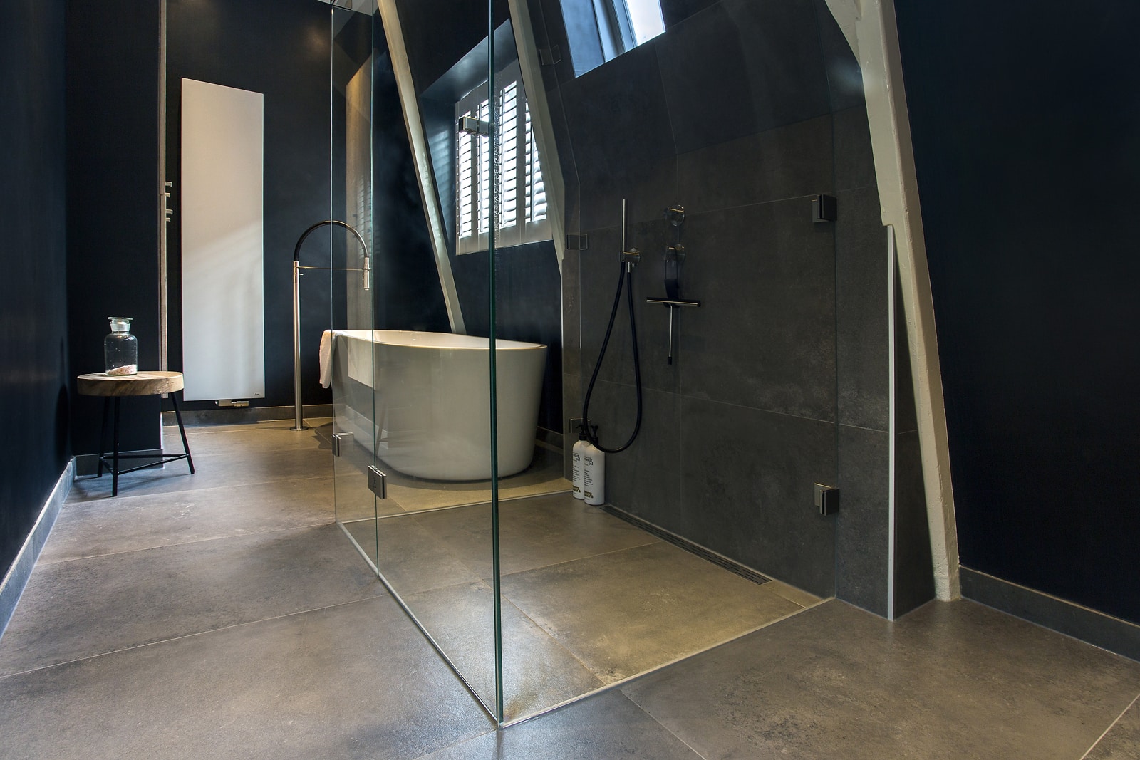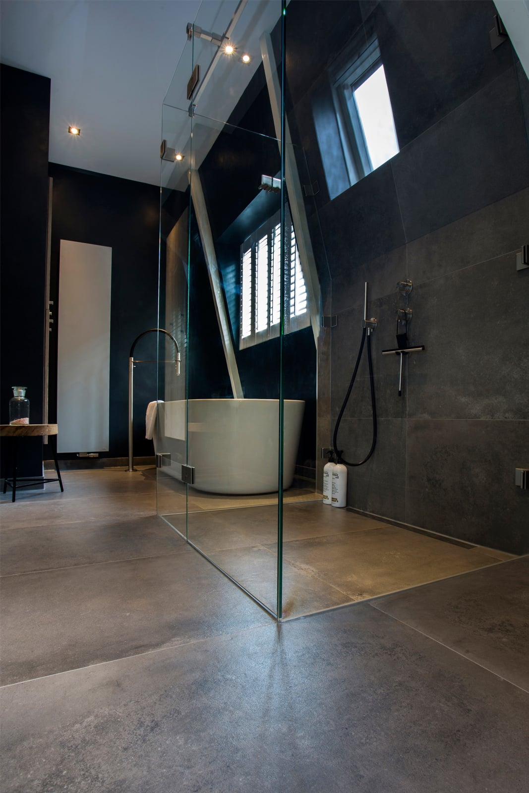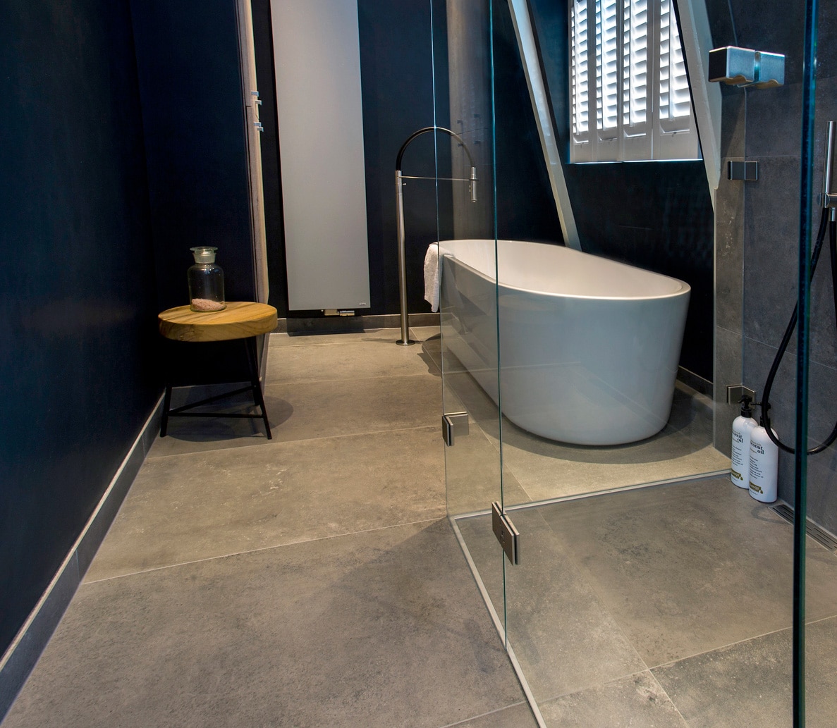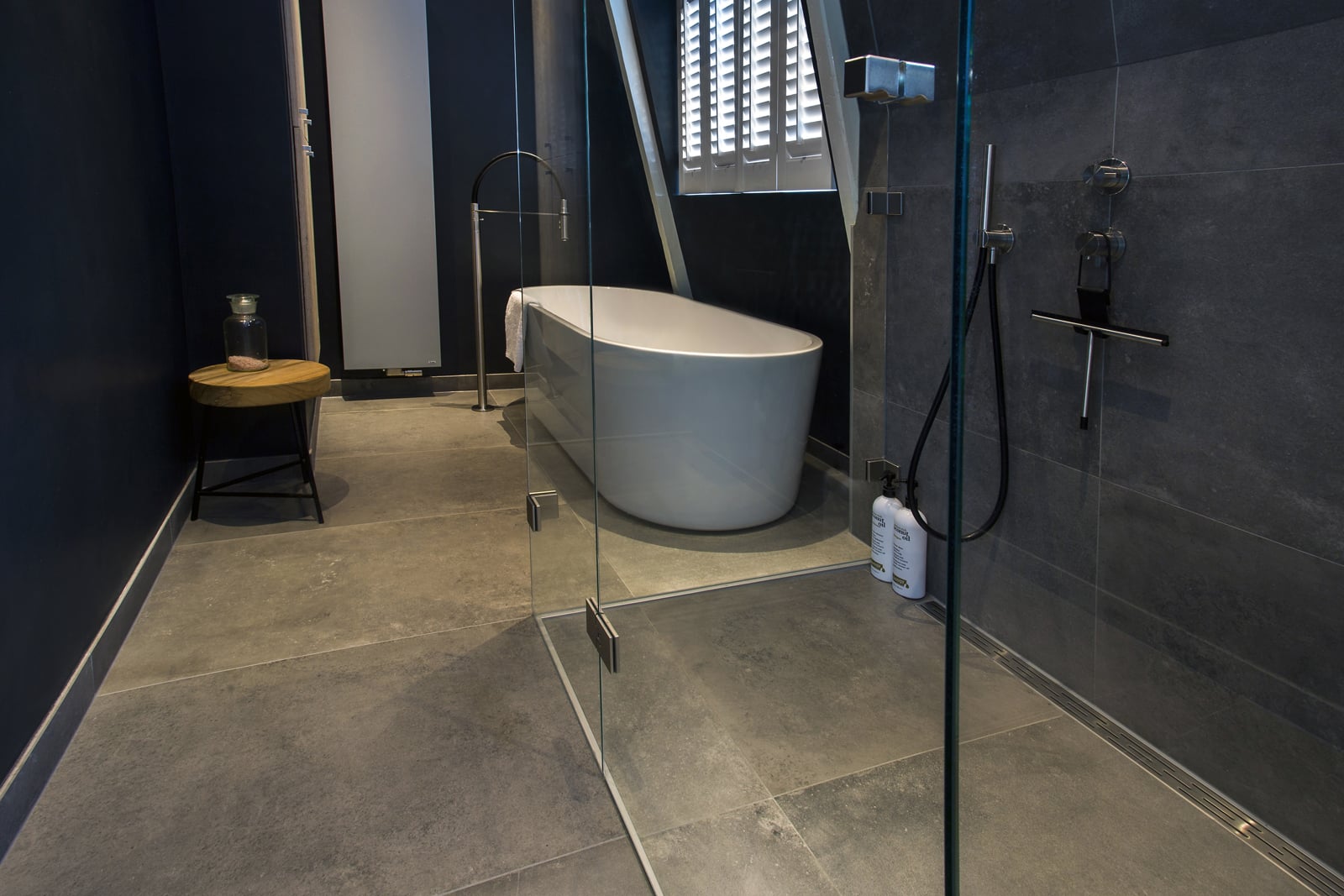 Deze moderne badkamer heeft alles wat u nodig hebt om ultiem te ontspannen. De combinatie van een strakke én warme uitstraling, aangevuld met fraaie industriële elementen geeft deze badkamer veel karakter. Een krachtig statement welke door de praktische indeling ook ruim oogt en aanvoelt. Dankzij bijvoorbeeld het transparante douchegedeelte krijgt de badkamer een open uitstraling wat een uitnodigende uitwerking heeft.