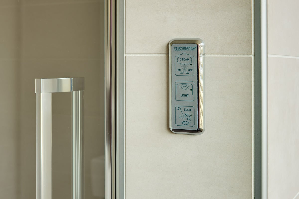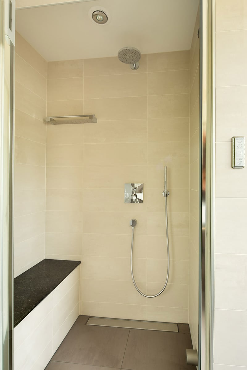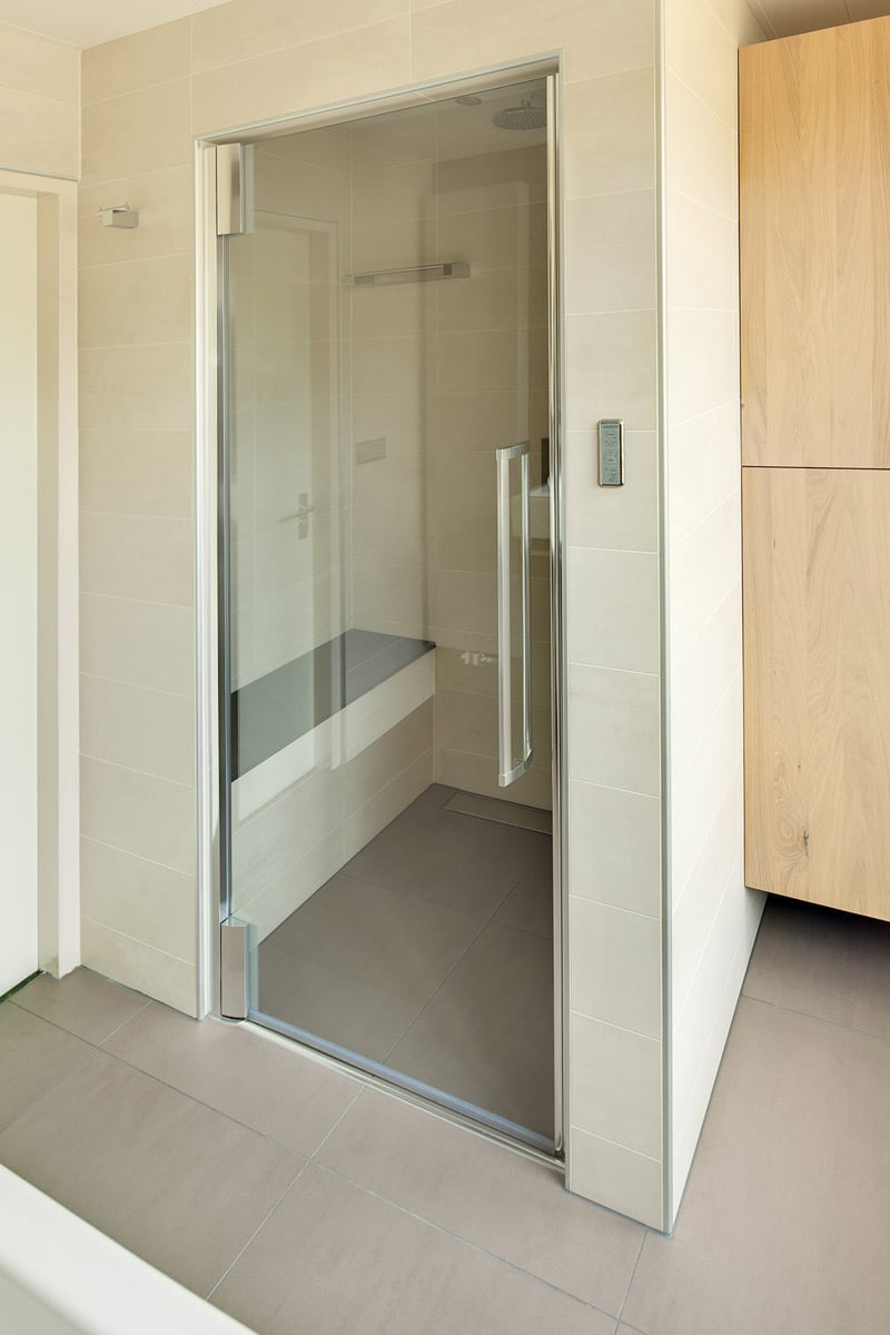 Deze strakke en moderne badkamer is van ontwerp tot montage volledig gerealiseerd door De Jong Sanitair & Tegelspecialist. De Cleopatra stoomfunctie in de douchecabine zorgt voor extra ontspanning. Door het effect van licht en het extra zitje in de douche beleeft u een intensieve wellness ervaring. U kunt uw stoombad bovendien voorzien van verschillende rustgevende stoombadgeuren, zoals eucalyptus.