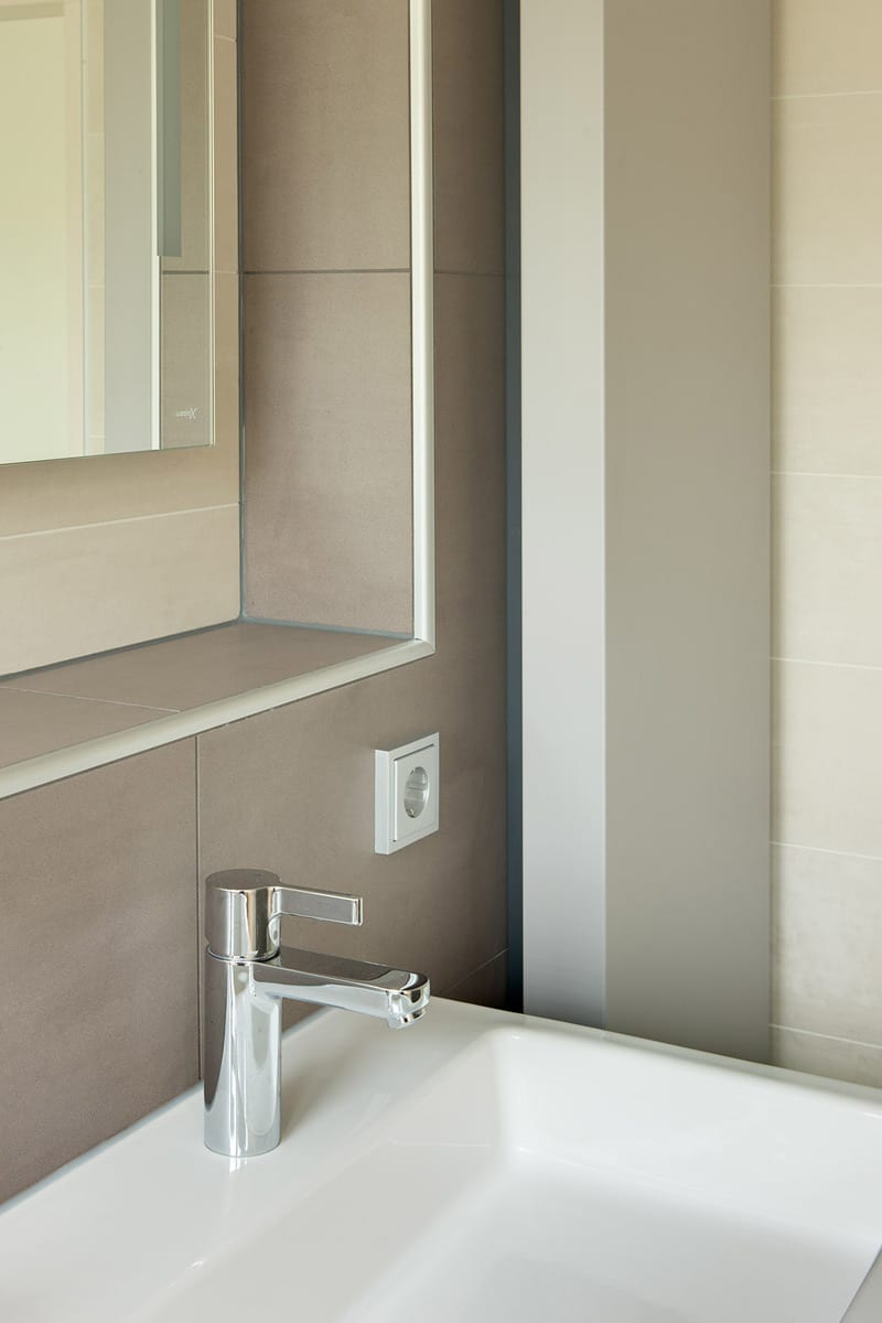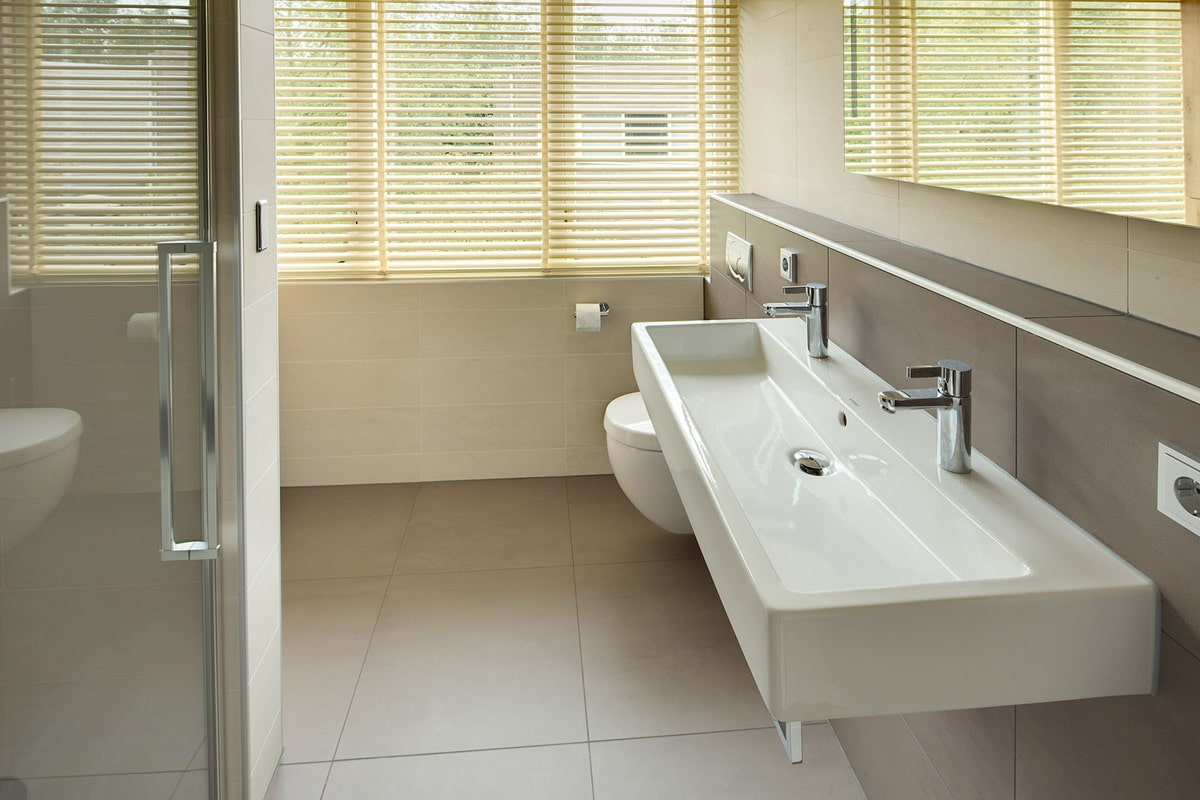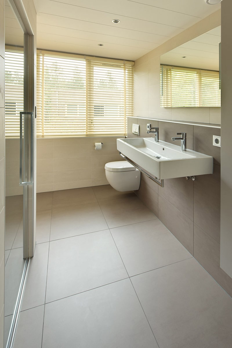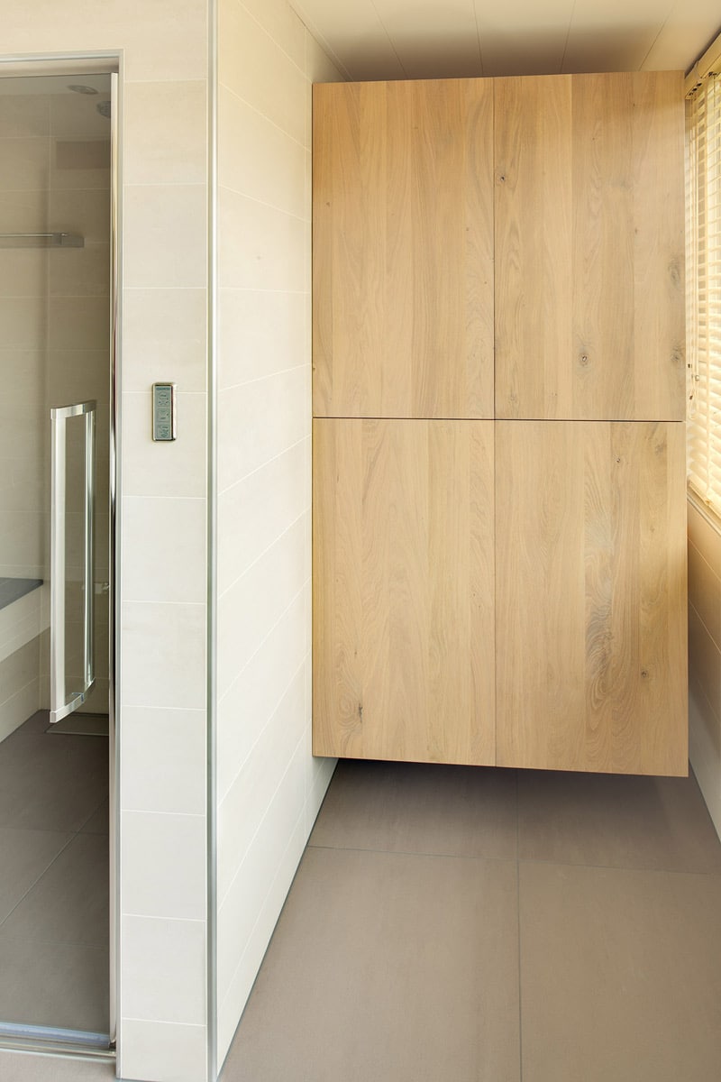Deze strakke en moderne badkamer is van ontwerp tot montage volledig gerealiseerd door De Jong Sanitair & Tegelspecialist. De Cleopatra stoomfunctie in de douchecabine zorgt voor extra ontspanning. Door het effect van licht en het extra zitje in de douche beleeft u een intensieve wellness ervaring. U kunt uw stoombad bovendien voorzien van verschillende rustgevende stoombadgeuren, zoals eucalyptus.