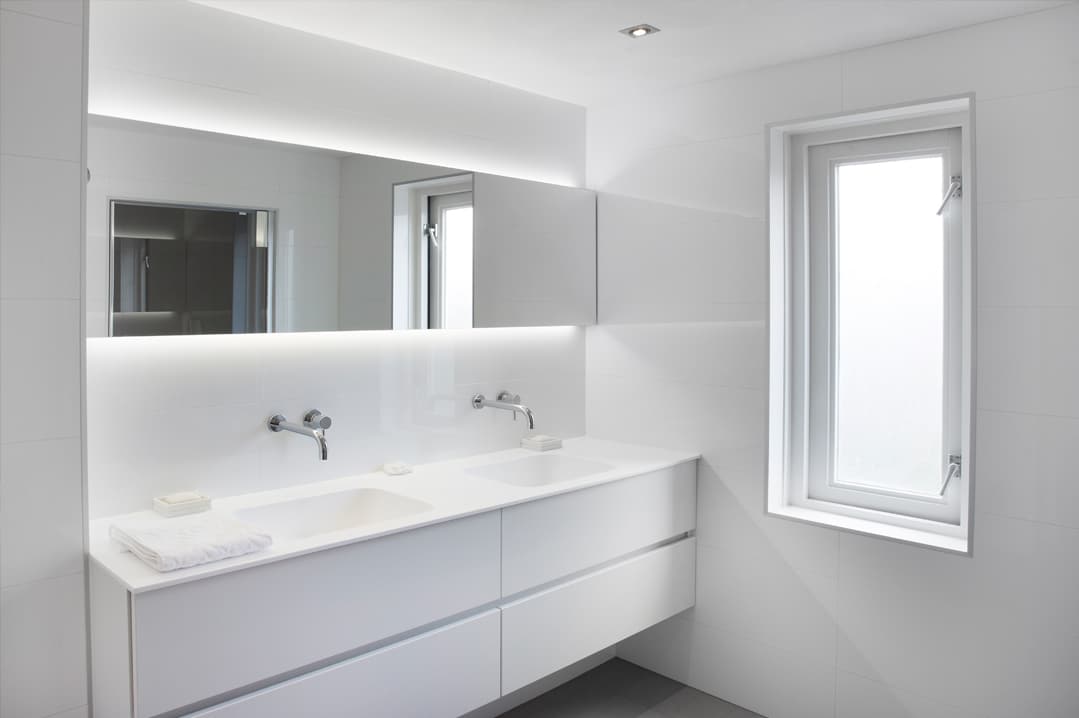 De kleur wit zorgt voor een ruim, licht en strak uiterlijk, iets wat goed tot zijn recht komt in deze badkamer. Deze badkamer, gerealiseerd door De Jong Sanitair & Tegelspecialist, is een geweldige aanwinst voor elk huis.