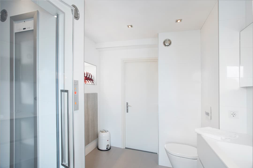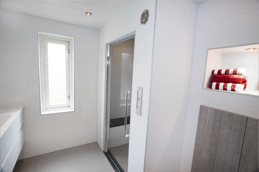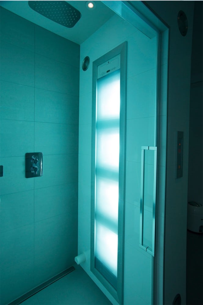 Het mooie aan deze badkamer is de ruime douchecabine met daarin een Sunshower. De Sunshower is een zonnebank met ingebouwde UV-en infrarooddampen die zorgt voor een mooie egale bruine tint en genoeg vitamine D. Genoeg ruimte en warmte dus om uw dag zo ontspannen mogelijk te beginnen of eindigen.