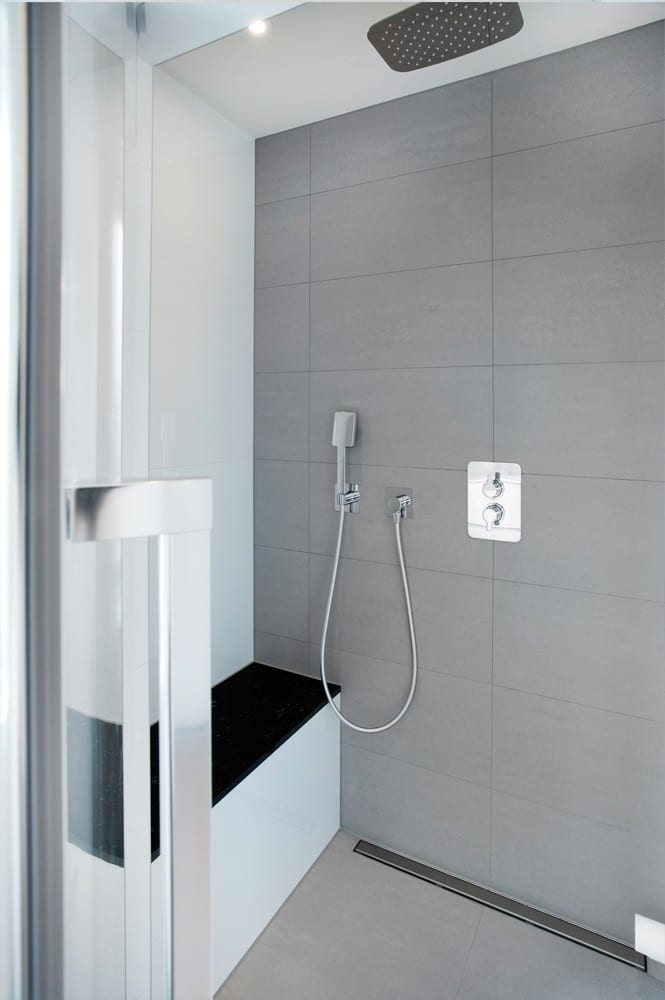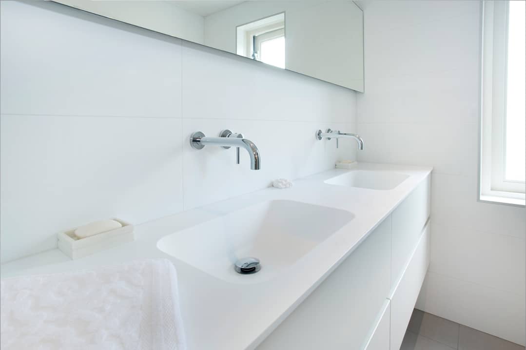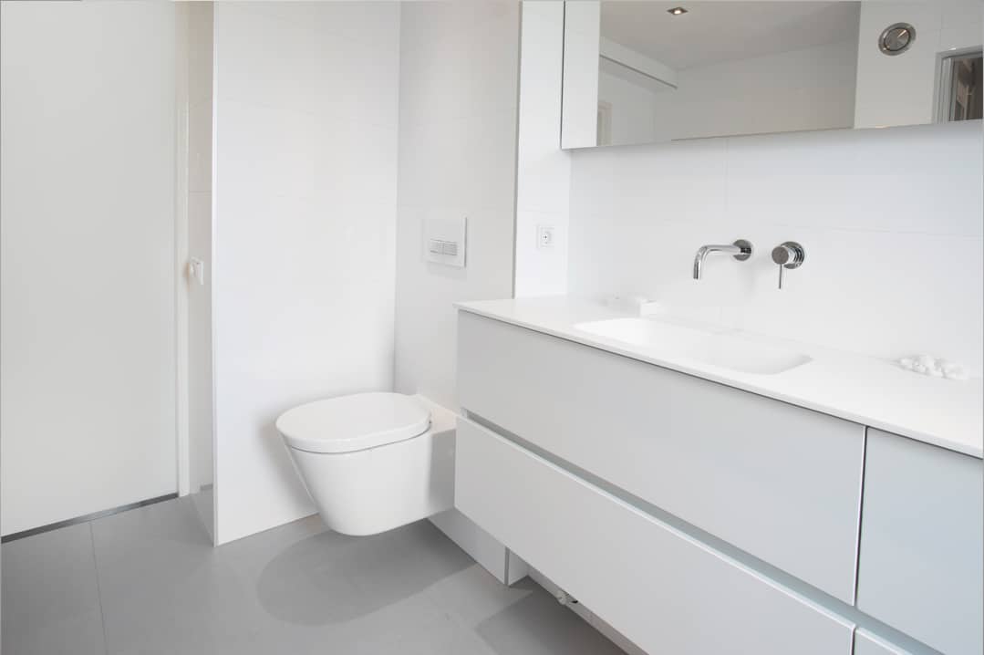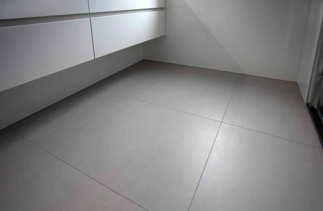De grote tegels in lichtgrijze tint sluiten goed aan bij de strakke witte muren. Een goedgelegde tegelvloer is makkelijk in onderhoud en gaat bovendien erg lang mee.