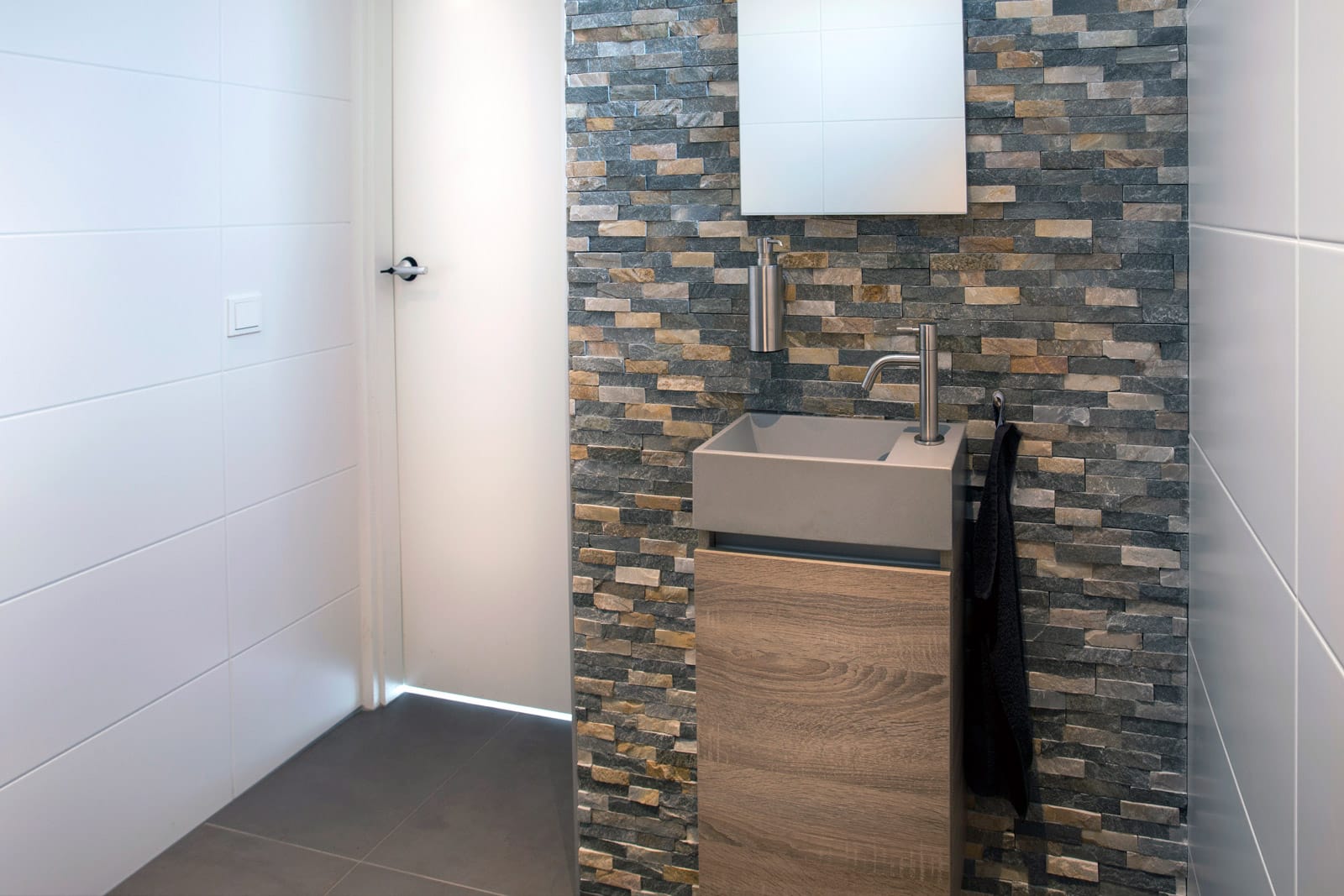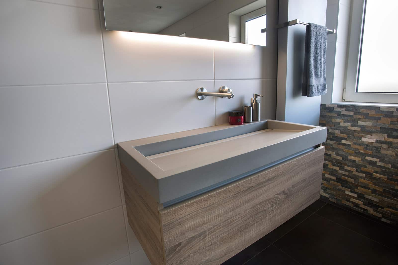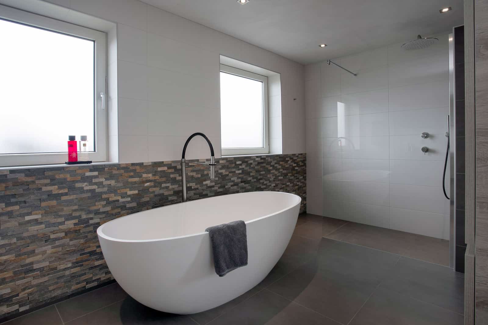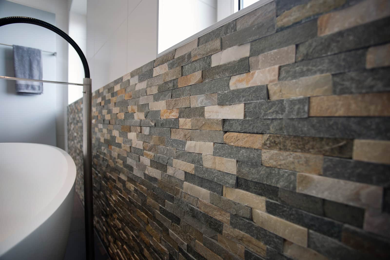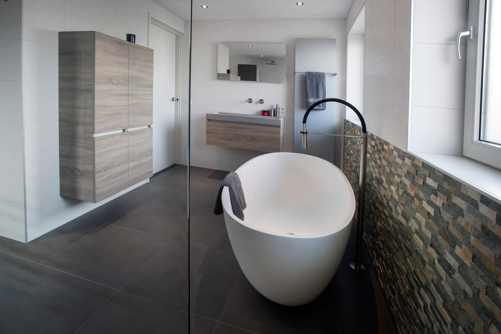 Eén van eyecatchers in deze strakke badkamer is het mooie steenpatroon welke achter de organisch gevormde badkuip langsloopt. Samen met de fraaie houtstructuren in het meubilair, zorgen deze ruwe en natuurlijke texturen voor warmte en karakter. Zo ontstaat er contrast in dit strakke interieur welke een uitnodigende uitwerking heeft.