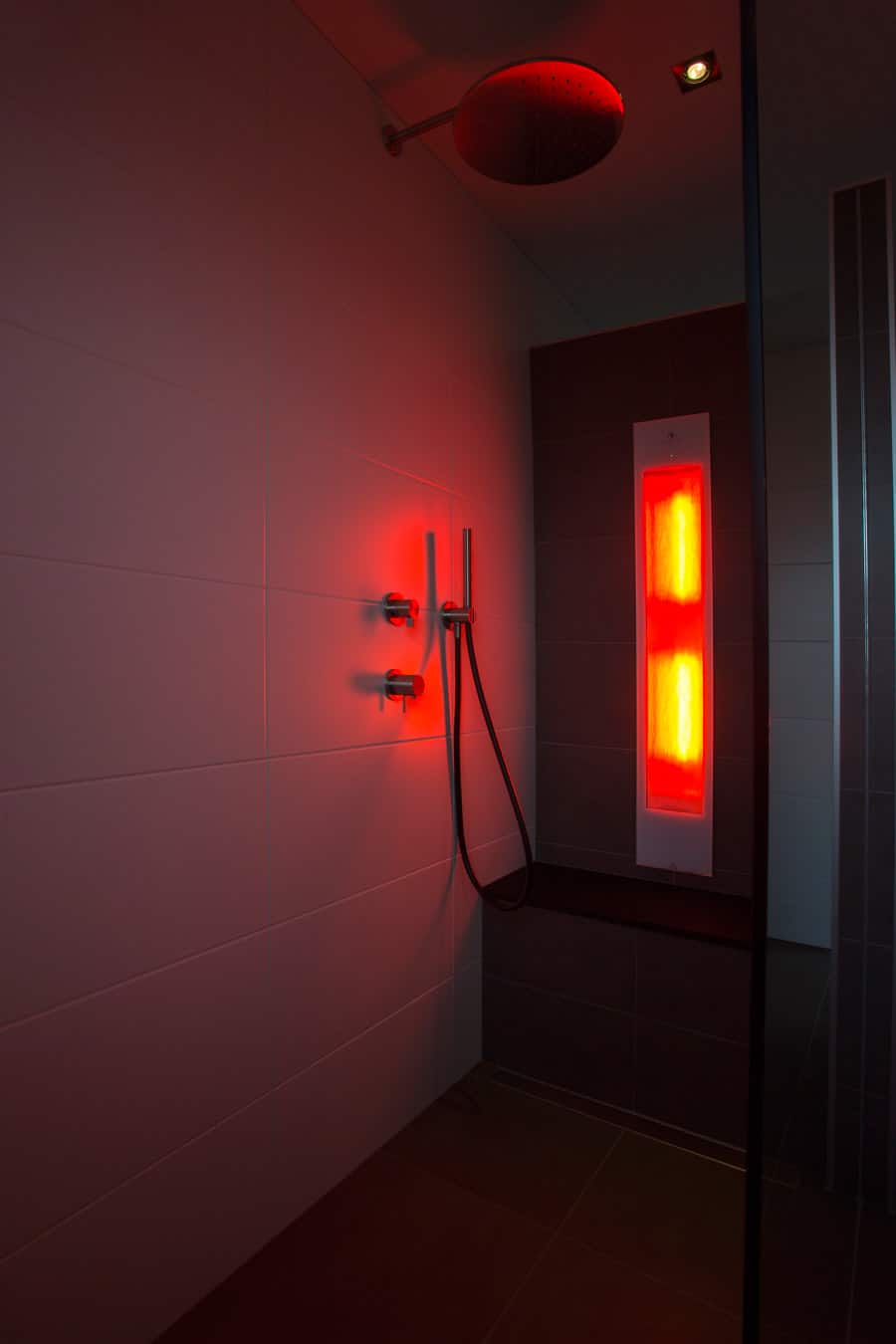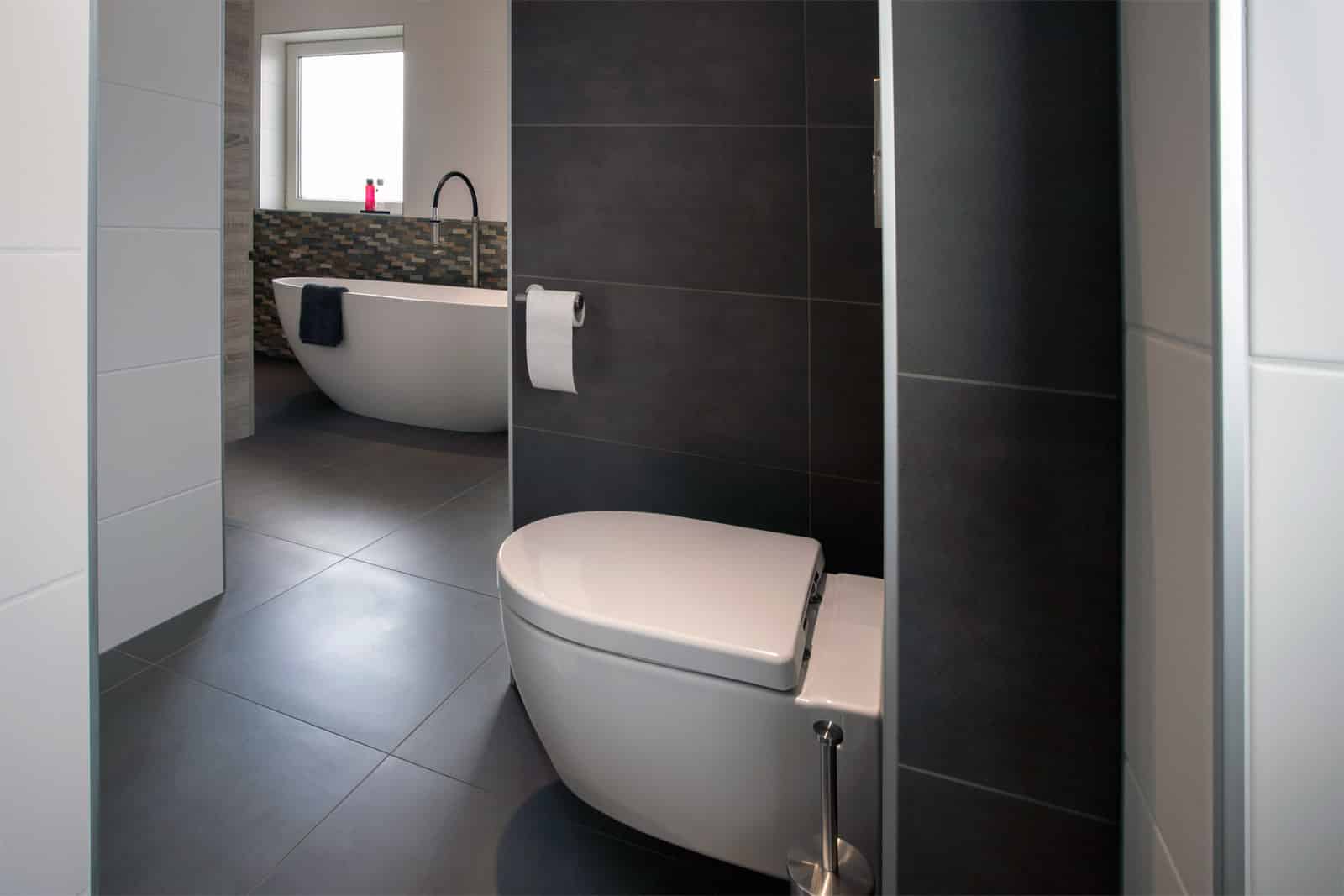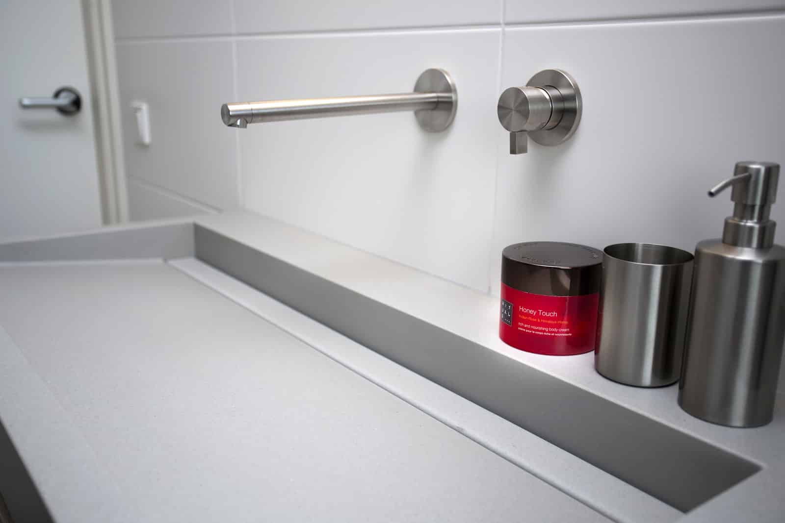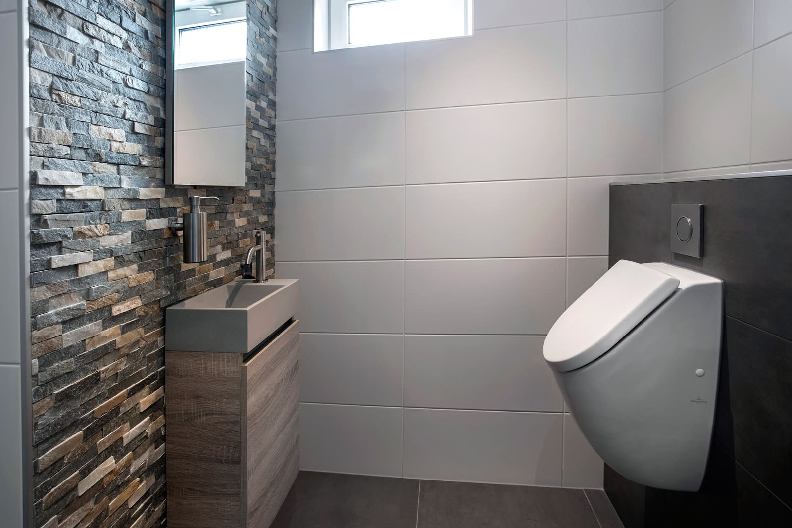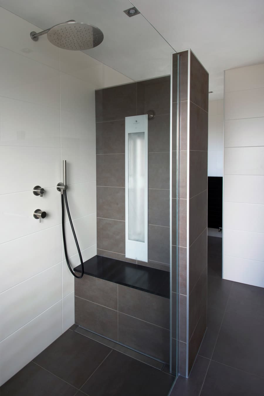 Eén van eyecatchers in deze strakke badkamer is het mooie steenpatroon welke achter de organisch gevormde badkuip langsloopt. Samen met de fraaie houtstructuren in het meubilair, zorgen deze ruwe en natuurlijke texturen voor warmte en karakter. Zo ontstaat er contrast in dit strakke interieur welke een uitnodigende uitwerking heeft.
