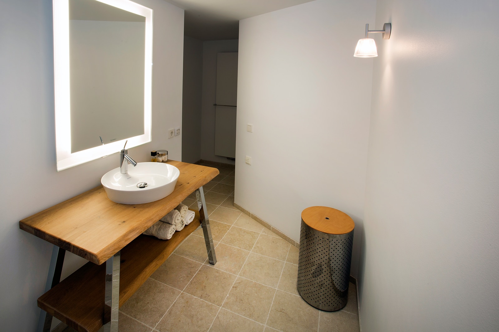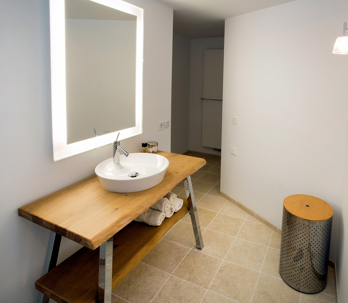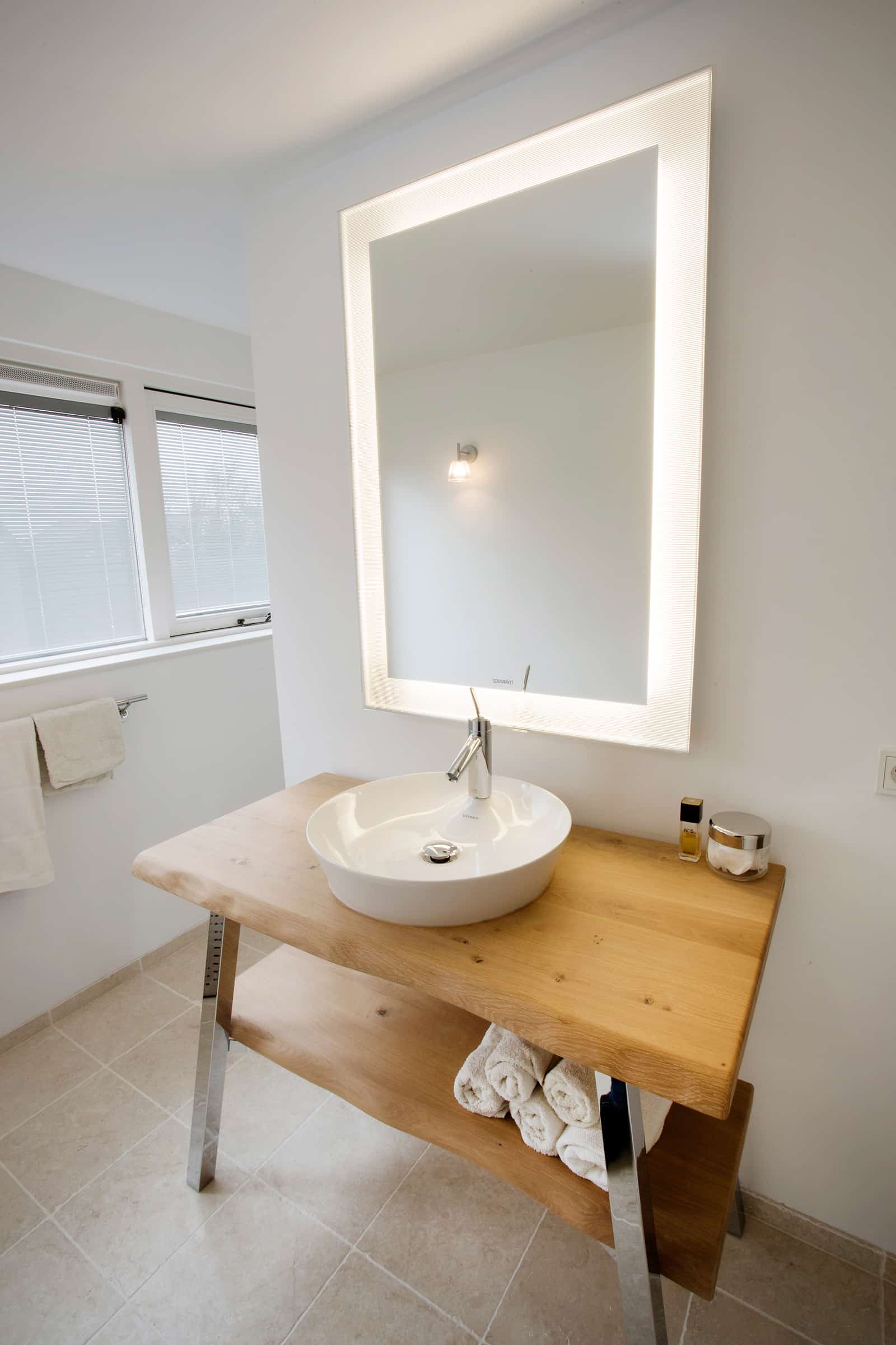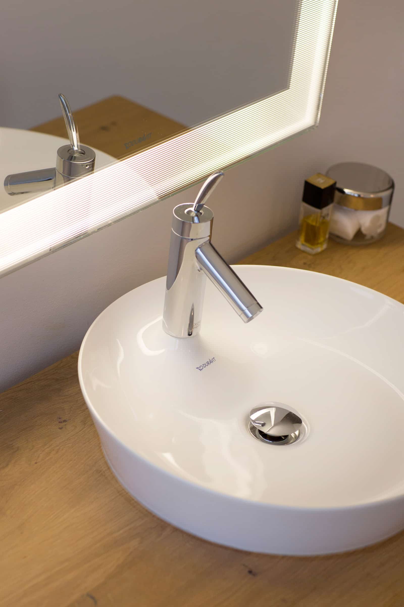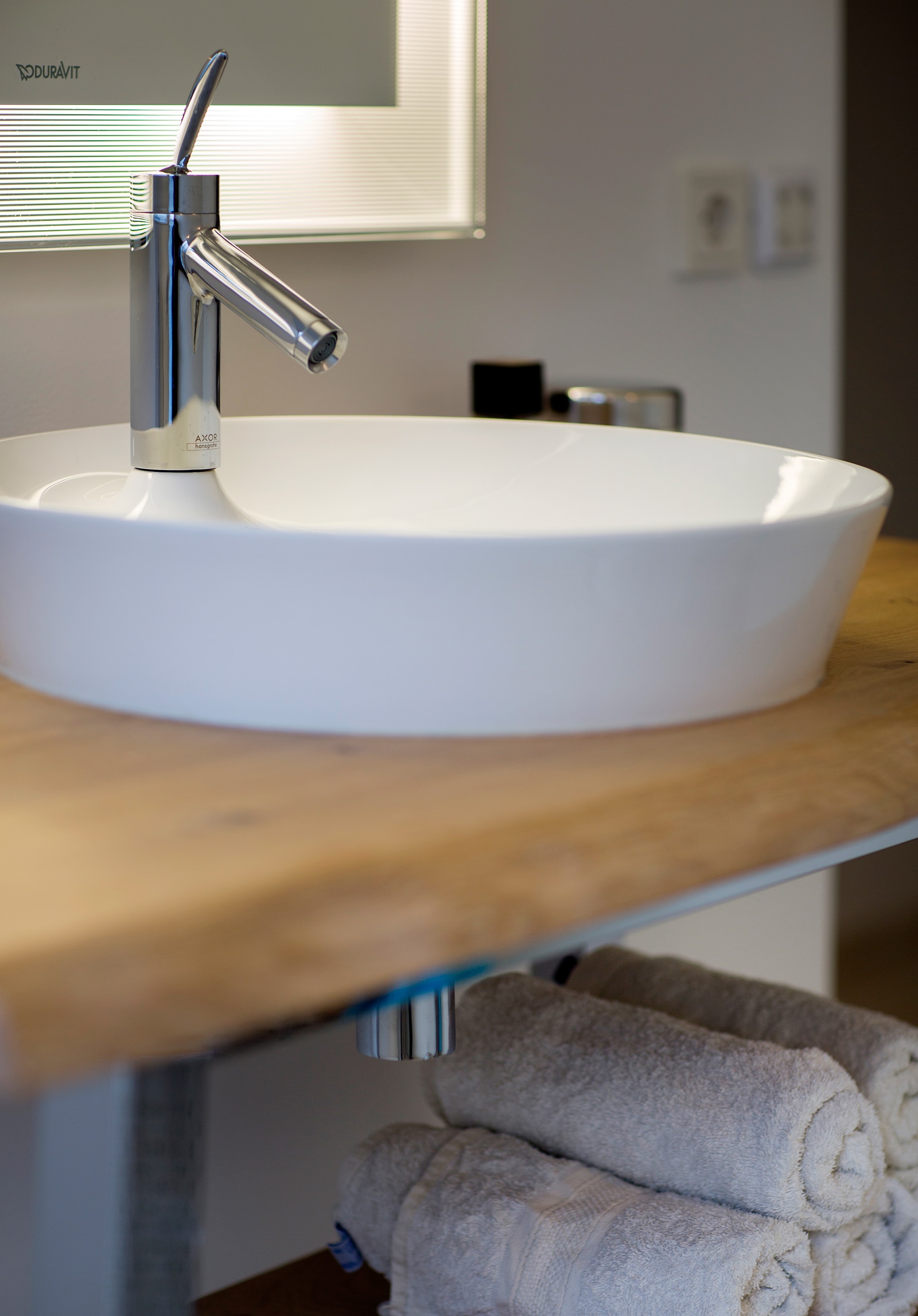 Het sanitair in deze badkamer is onder meer van Duravit en Hansgrohe Axor. Zo is de douche voorzien van een Axor Starck glijstangset inclusief handdouche geheel gemaakt van chroom. Axor werkt samen met wereldberoemde designers en architecten. Dat is te zien aan het strakke en compacte design. Door de compromisloze kranen verbruikt u ook nog eens minder water.