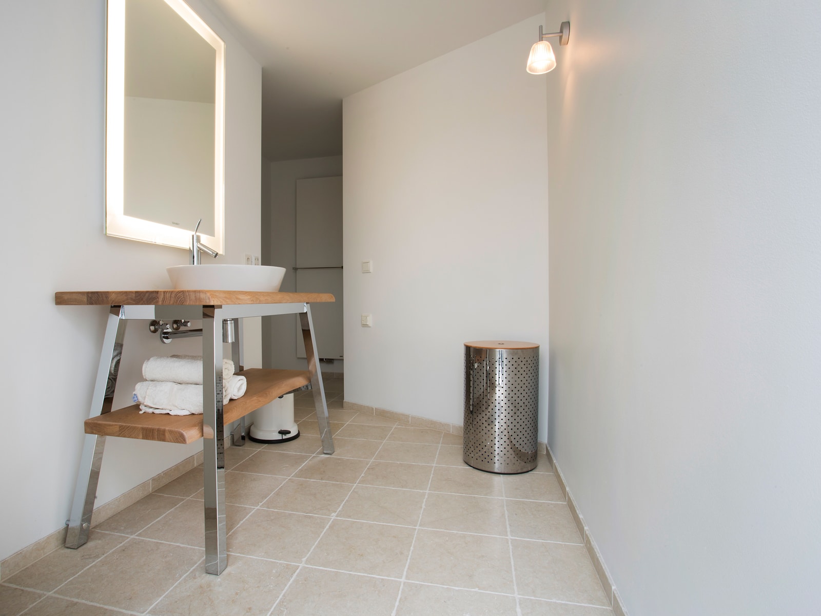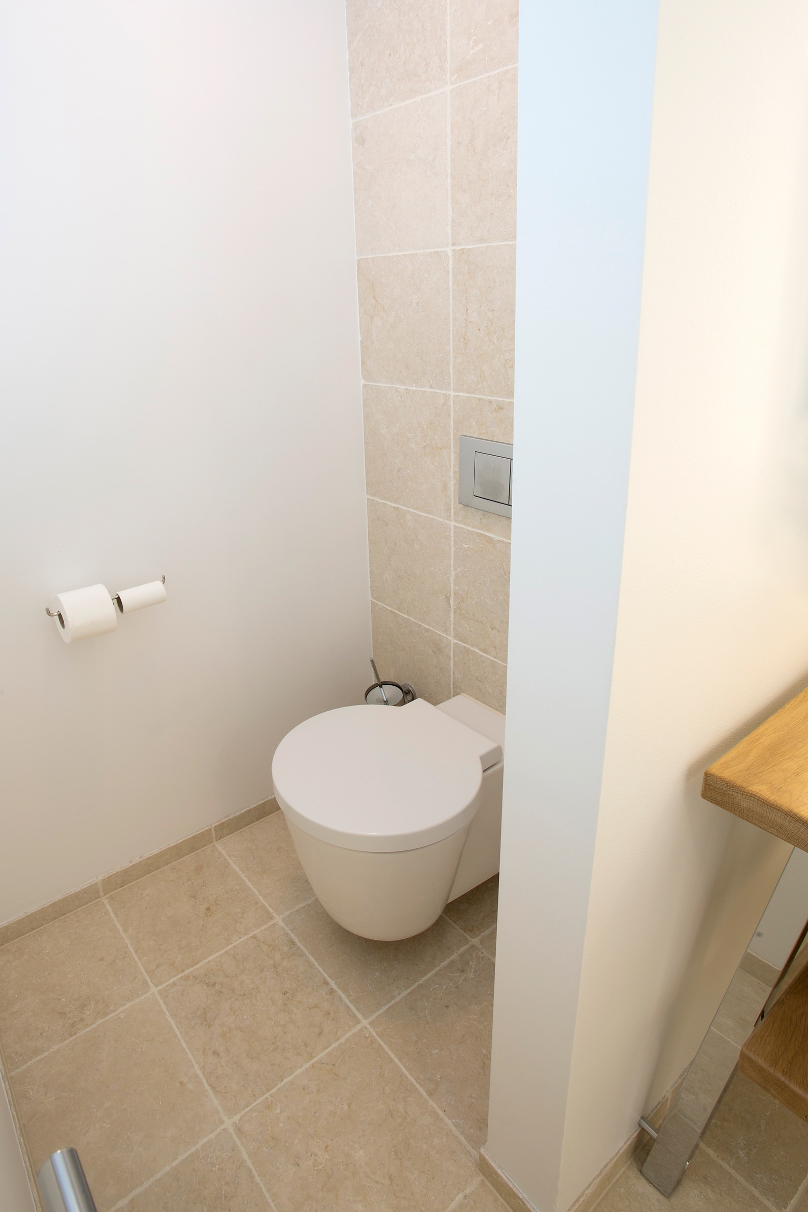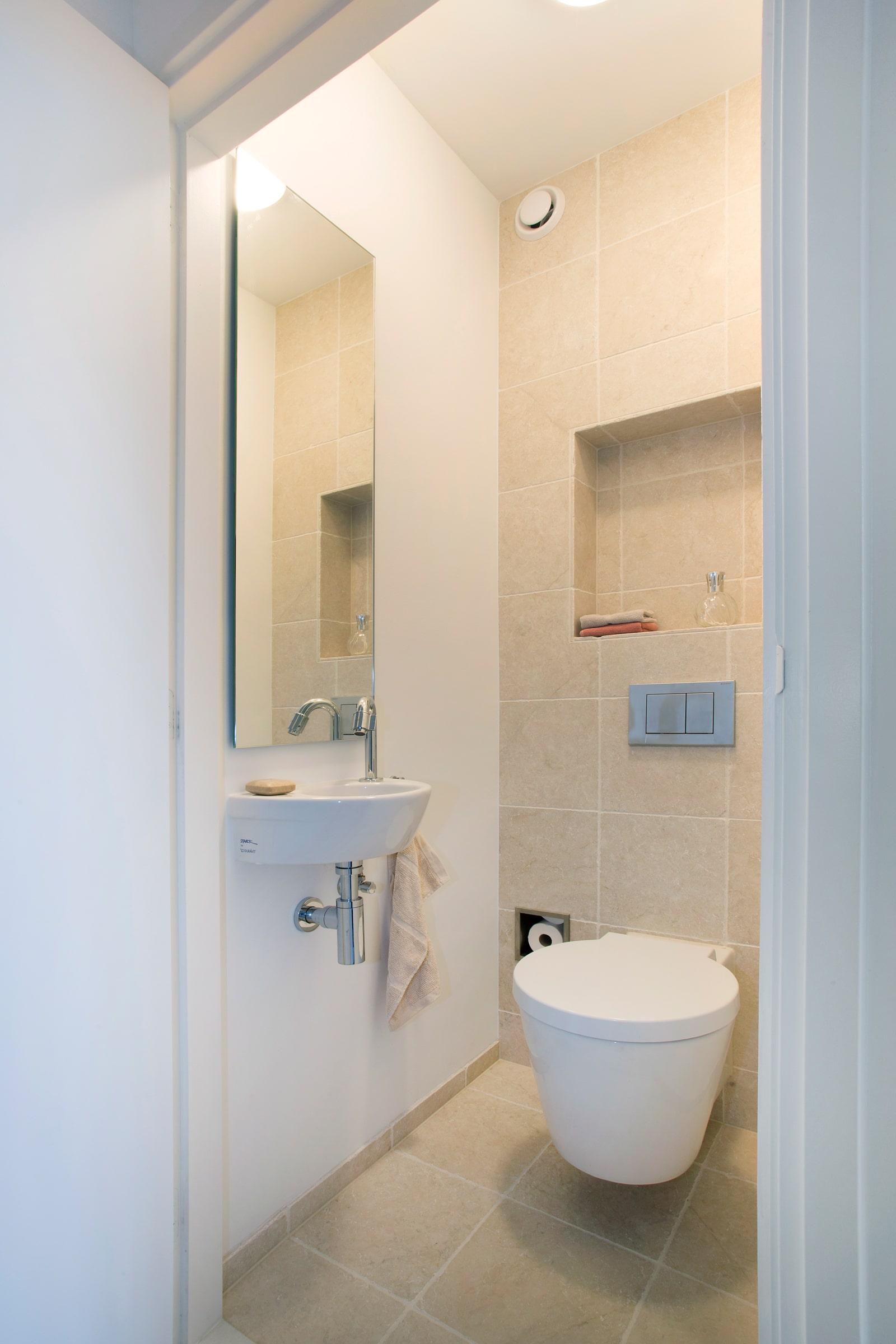 Niet alleen de badkamer geeft een ruime indruk maar ook het toilet. Dit komt onder andere, doordat er slim gebruik is gemaakt van de muren. Hier zijn verscheidene zaken naadloos in verwerkt zoals de wc-rolhouder. Wederom zijn hier beige tegels te vinden met witte muren aan twee zijden. Alweer tot in puntjes afgewerkt; door de Jong natuurlijk!