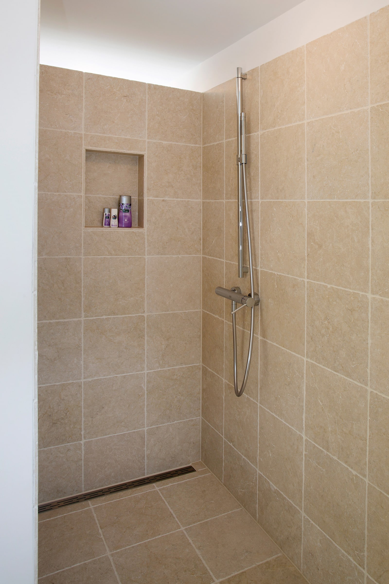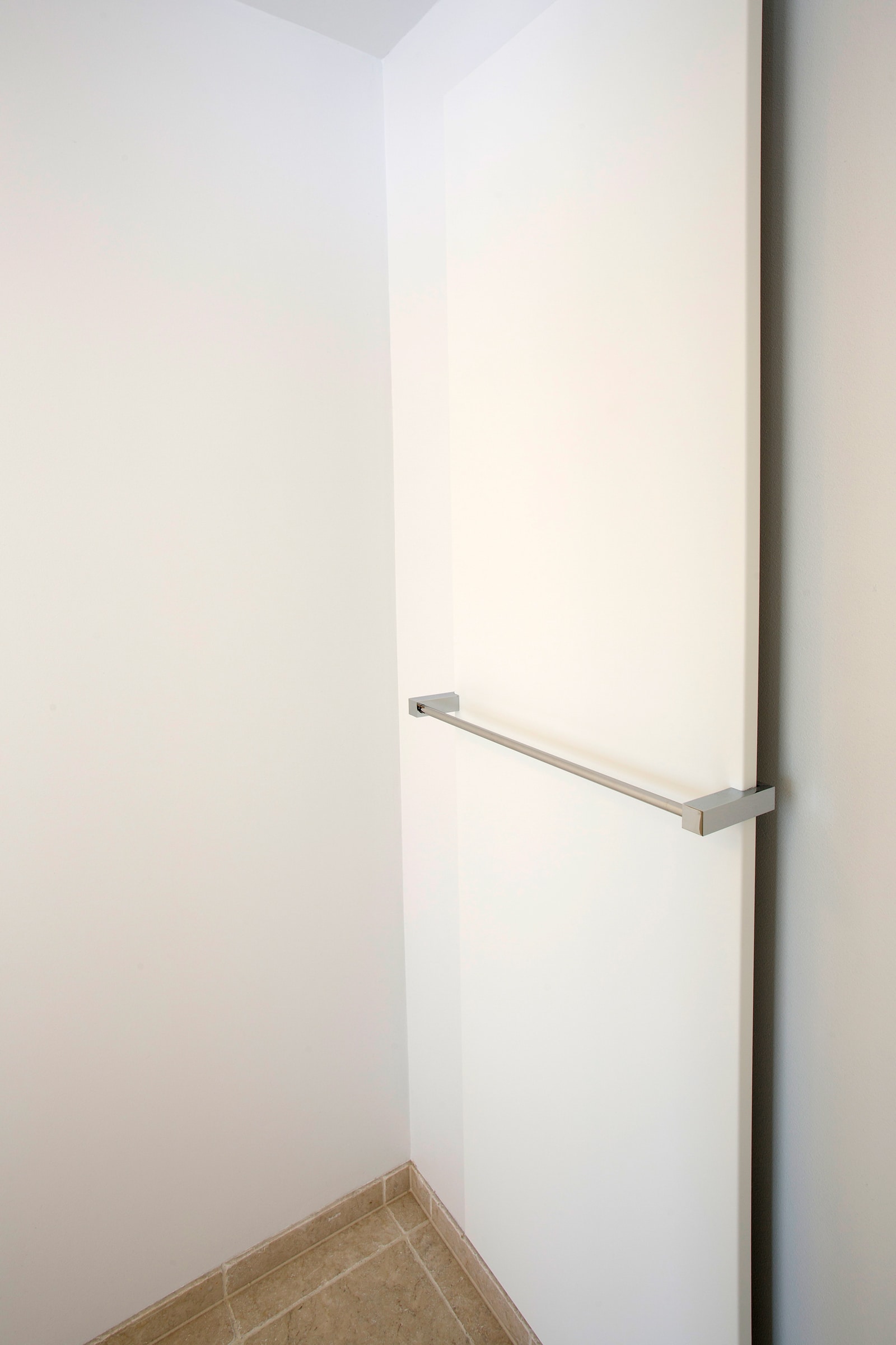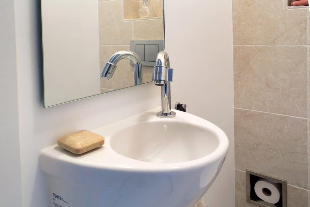 Niet alleen de badkamer geeft een ruime indruk maar ook het toilet. Dit komt onder andere, doordat er slim gebruik is gemaakt van de muren. Hier zijn verscheidene zaken naadloos in verwerkt zoals de wc-rolhouder. Wederom zijn hier beige tegels te vinden met witte muren aan twee zijden. Alweer tot in puntjes afgewerkt; door de Jong natuurlijk!