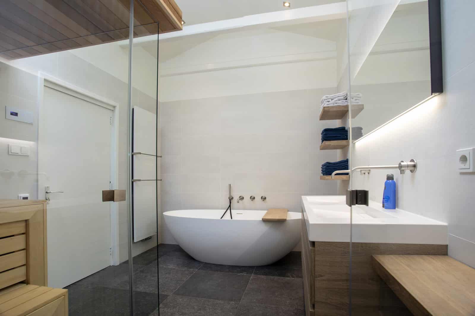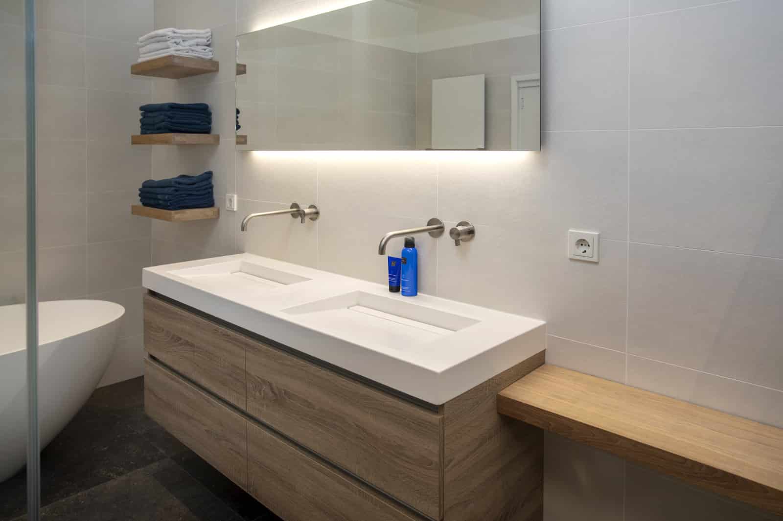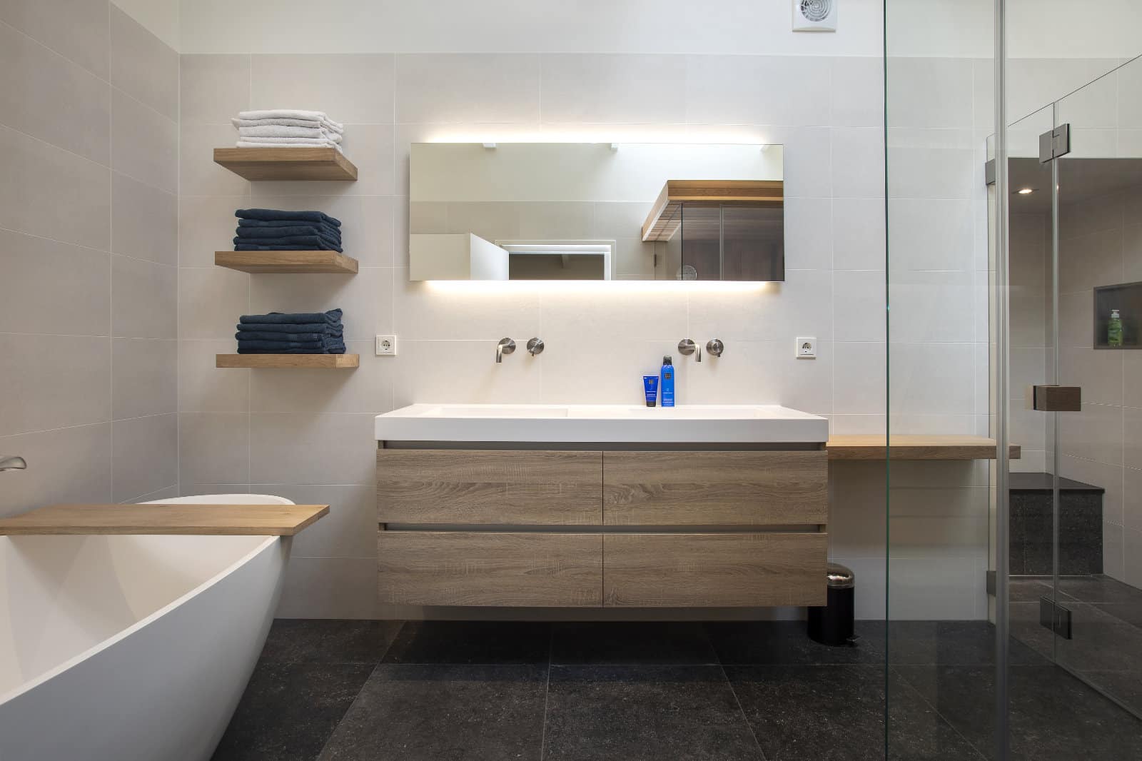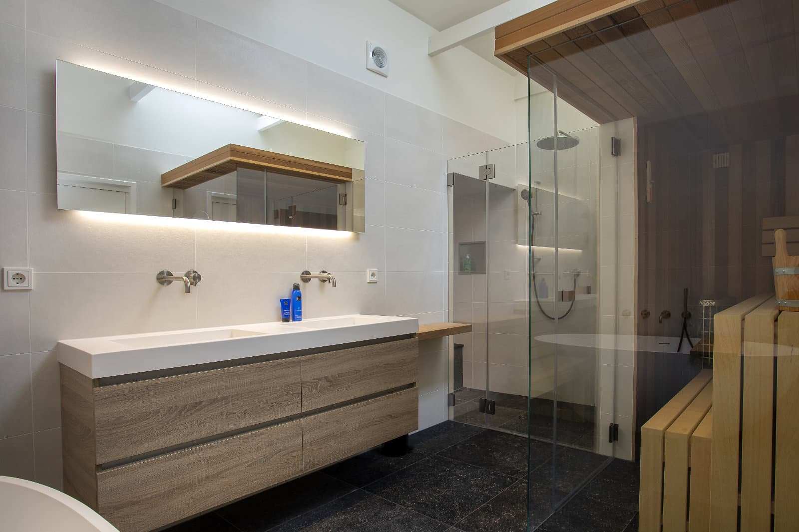 De eigenaren van deze prachtige wellness badkamer wilden een warme en sfeervolle badkamer met wellnesselementen om zich volledig te kunnen ontspannend. Niet alleen dat. Dit alles binnen een bepaald budget. De Jong Sanitair heeft deze wellness badkamer vervolgens in zijn geheel op maat ontworpen. Alles wat u ziet is maatwerk. Ook hebben we de realisatie in zijn geheel op ons genomen. Dit, zodat onze klant volledig ontzorgd werd.