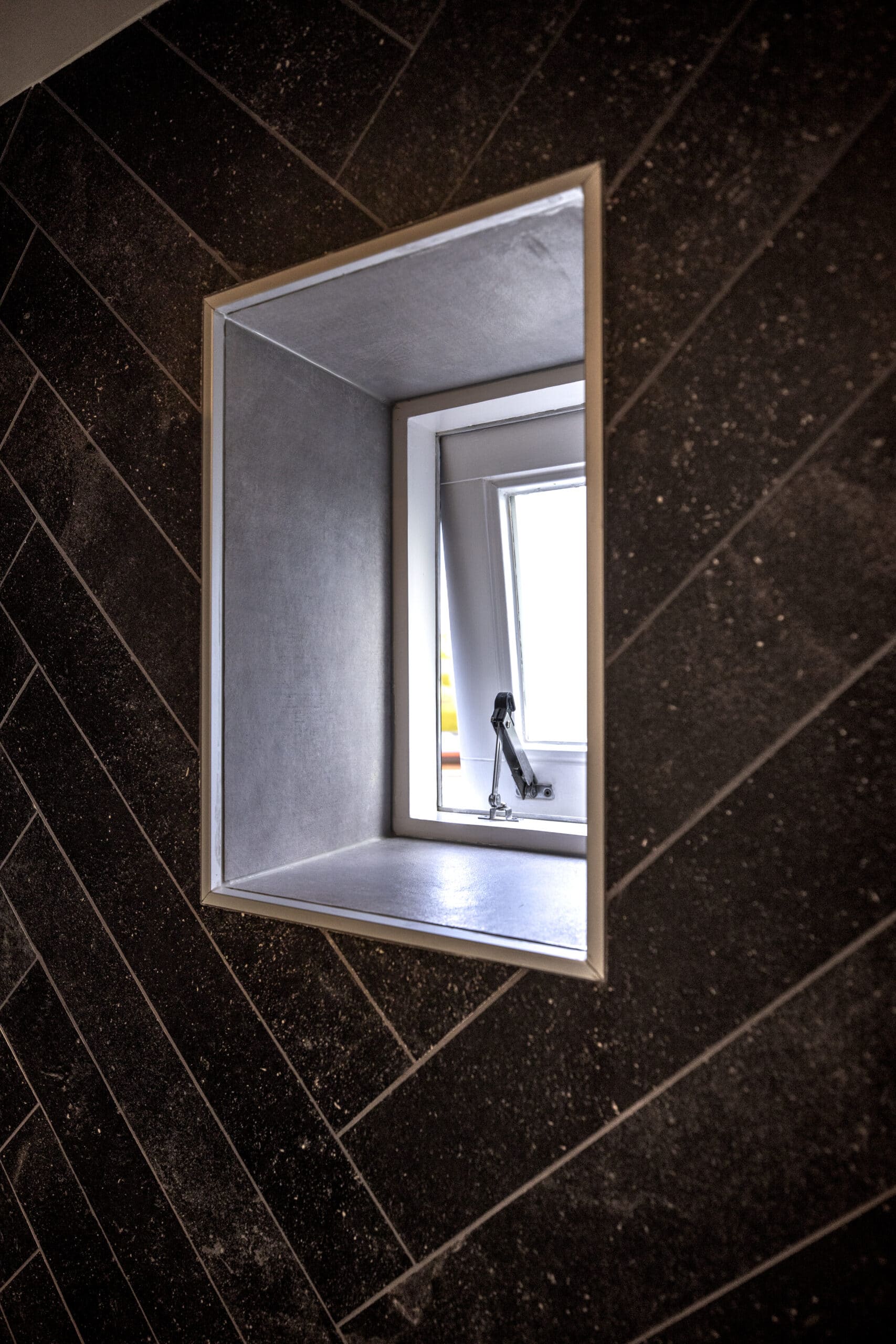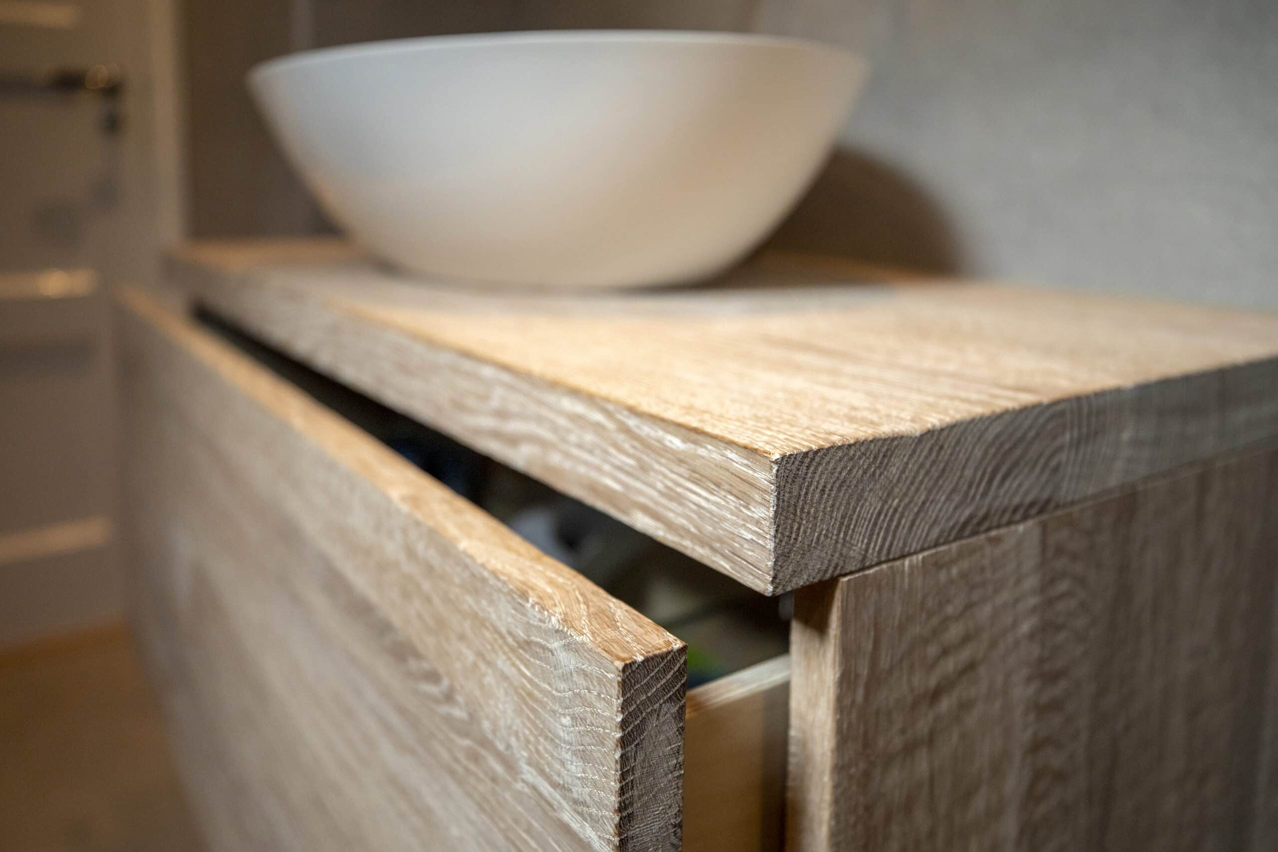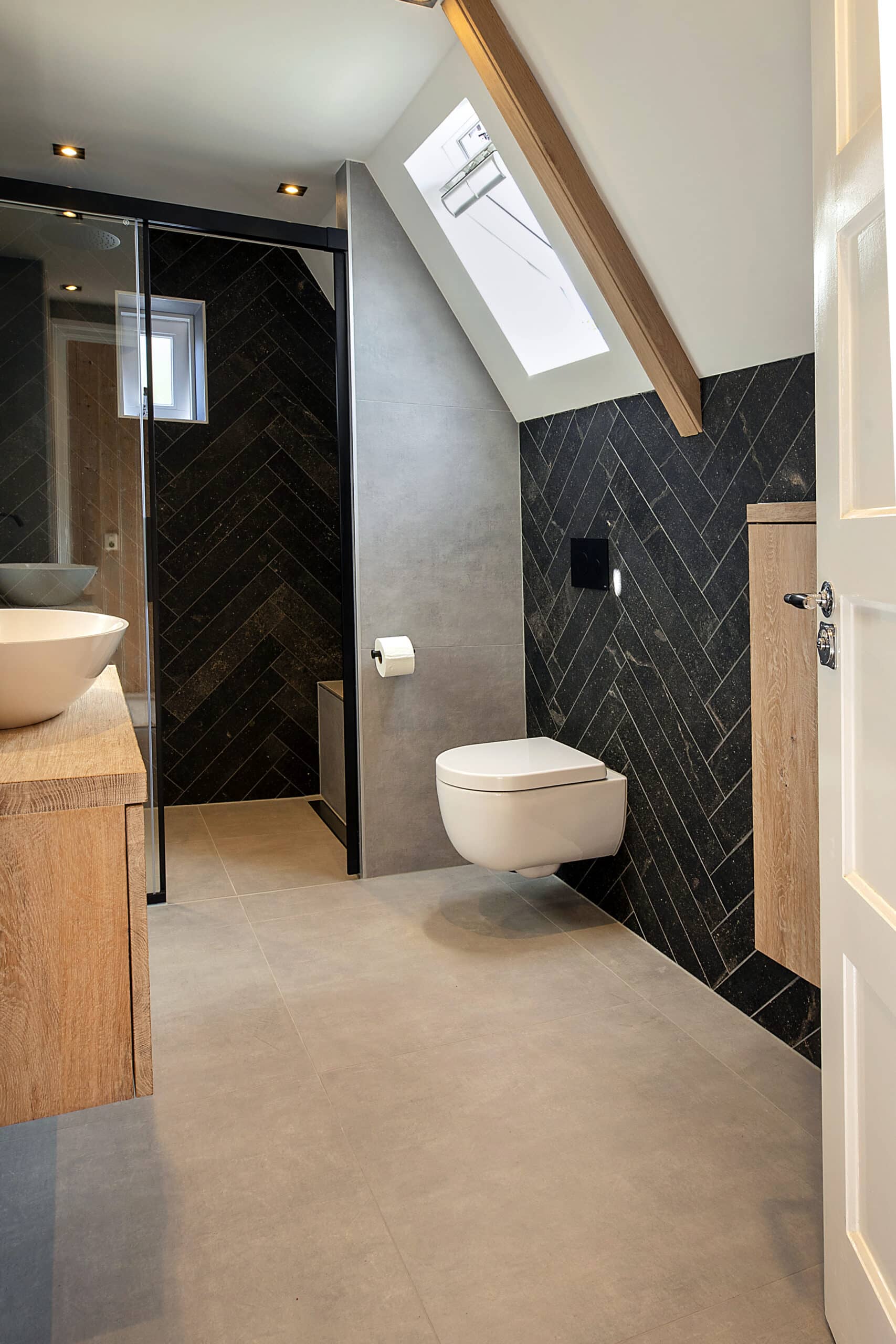 Het zwevende wastafelmeubel en de ingebouwde kast, gemaakt van warm hout, voegt een natuurlijke en rustieke uitstraling toe aan het geheel. Het zorgvuldig afgewerkte hout zorgt niet alleen voor een sfeervolle uitstraling, maar ook voor praktische opbergruimte. Hierdoor blijft de badkamer altijd opgeruimd en overzichtelijk.