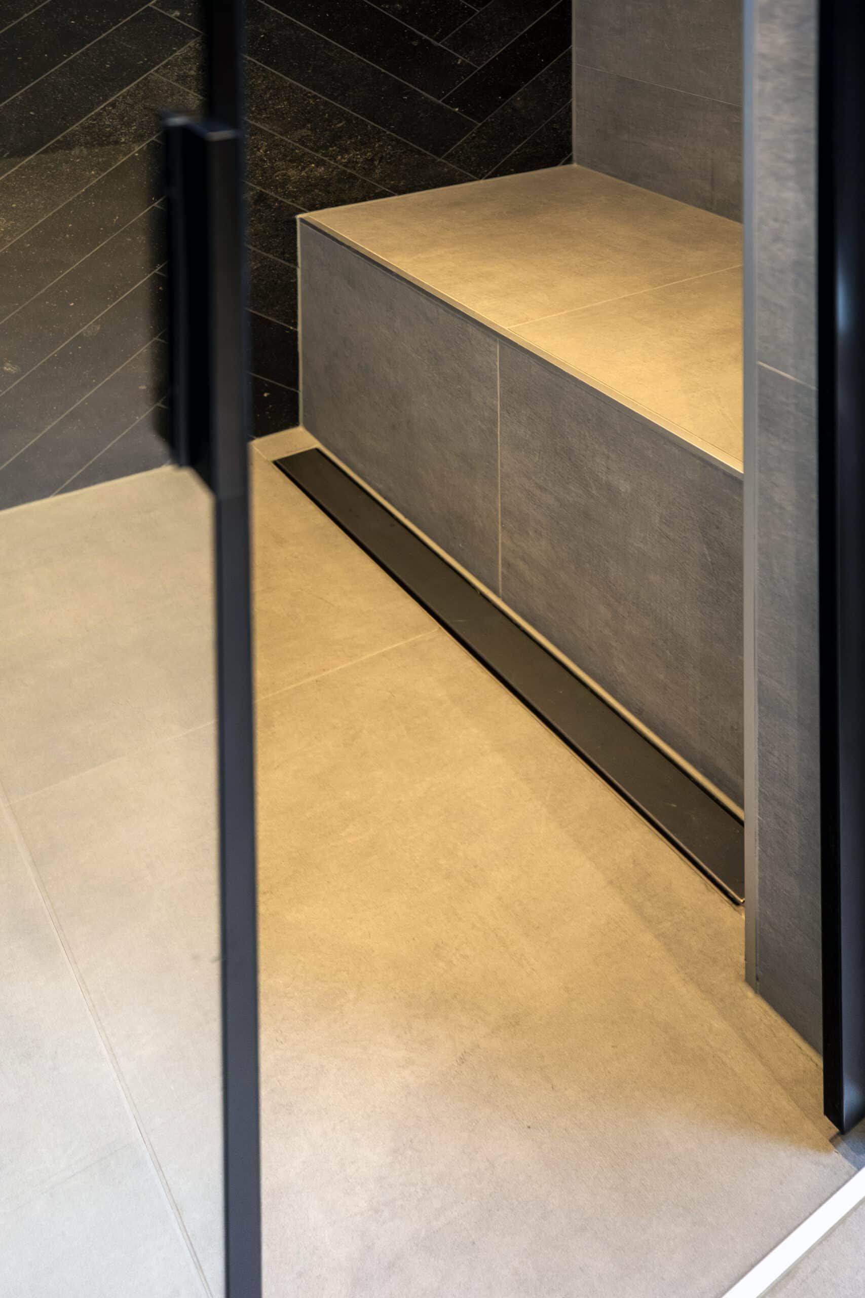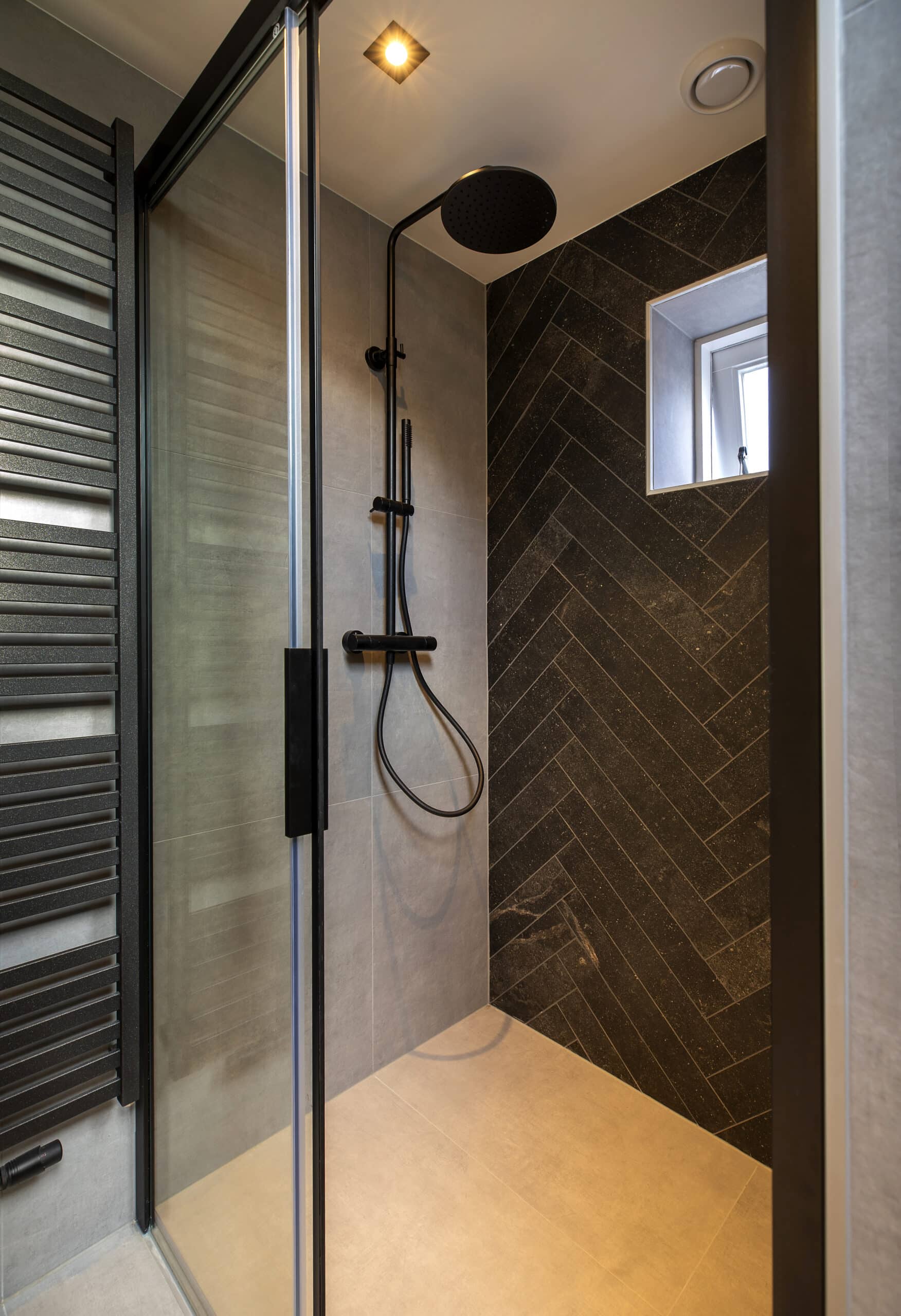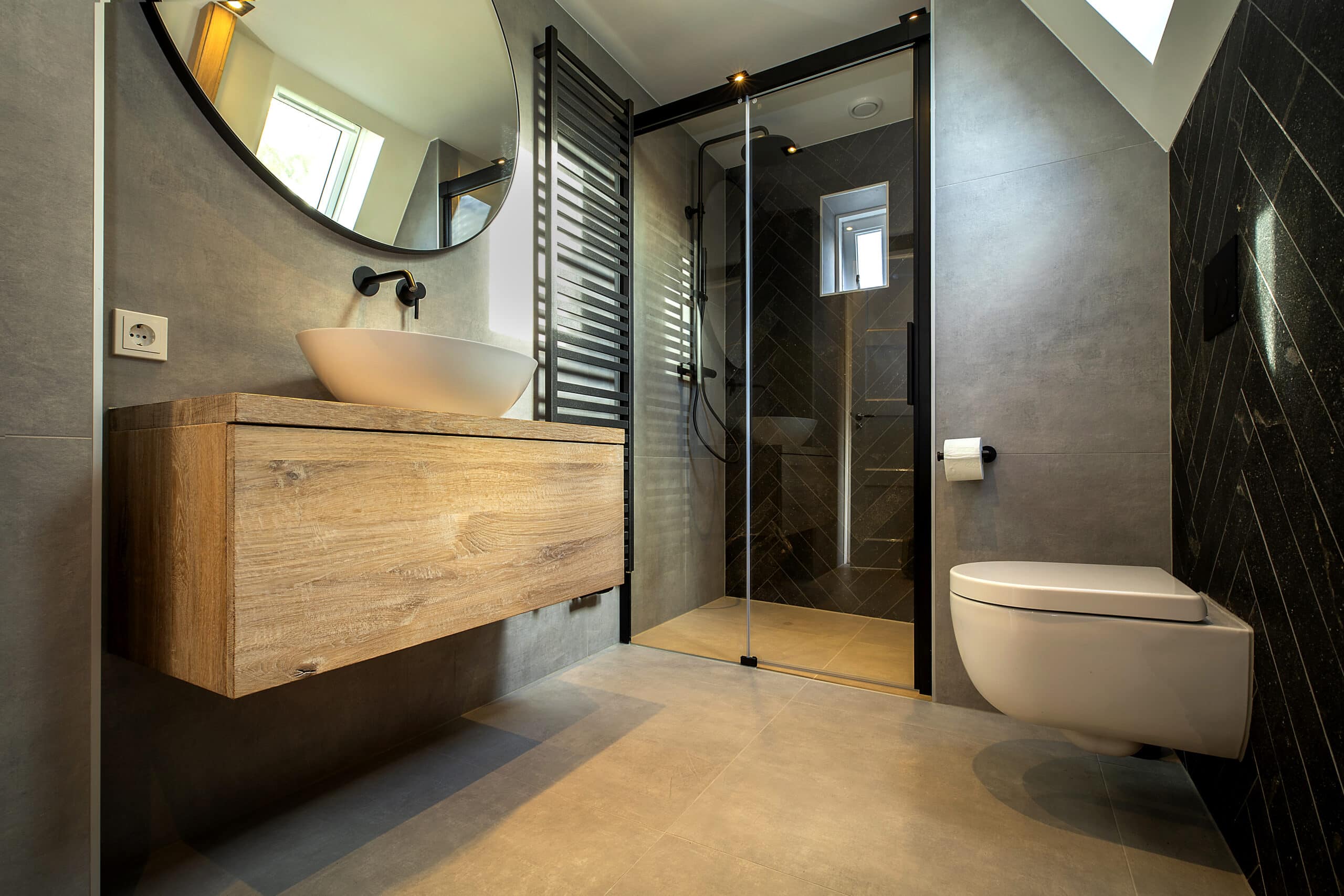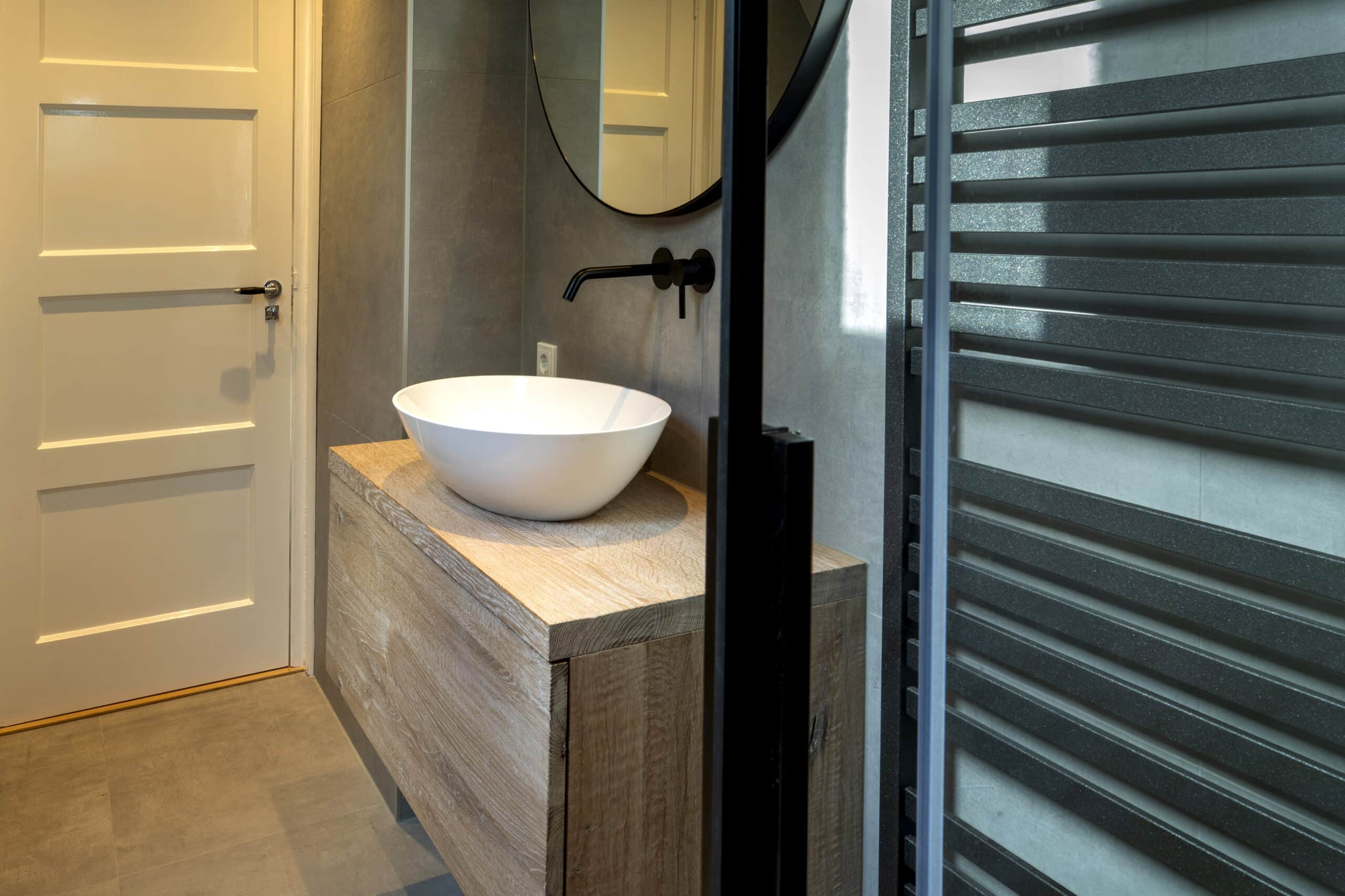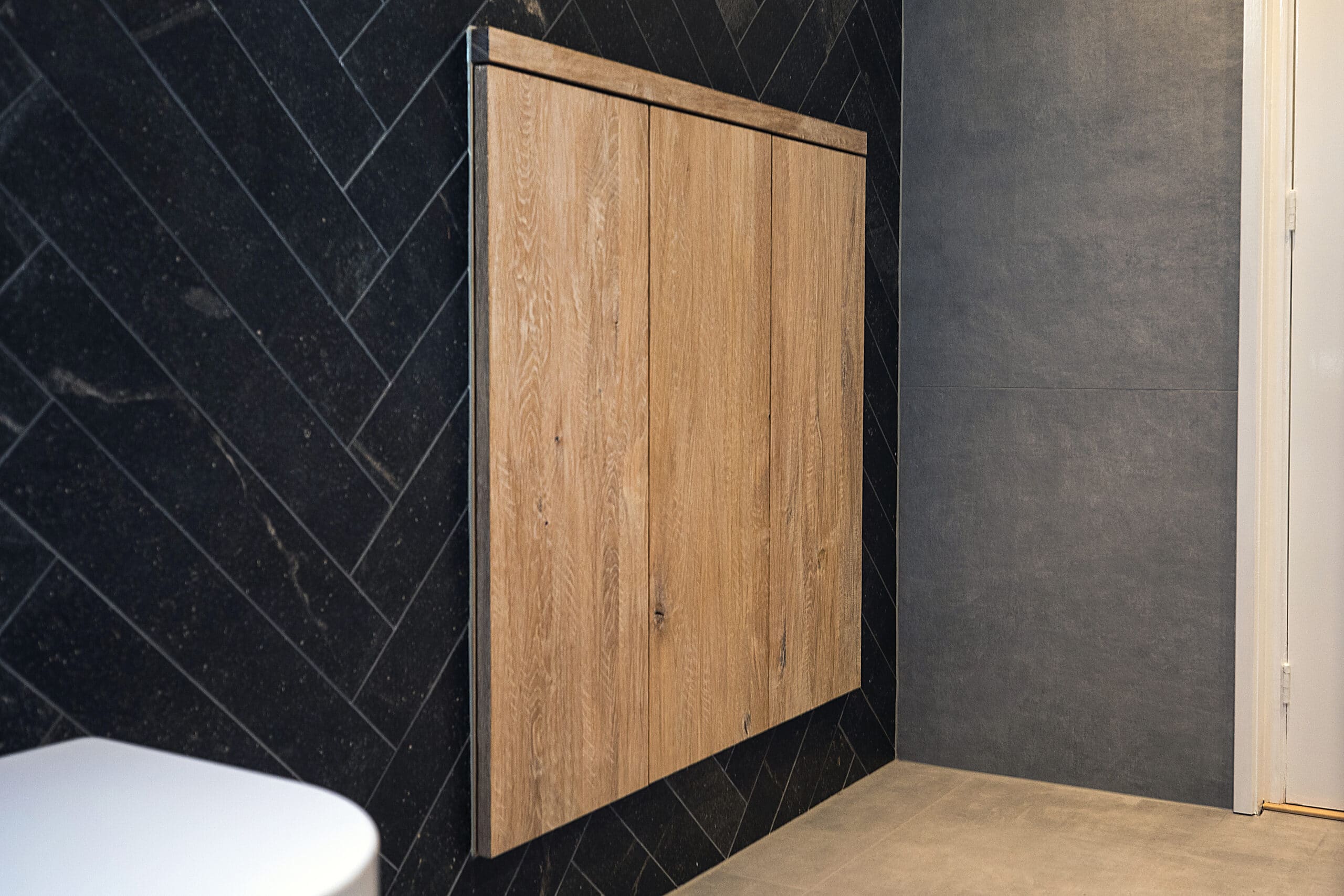 Matzwarte accenten, zoals de slanke designkraan en de verticale radiator, geven de badkamer een eigentijdse look. Deze strakke details zorgen voor een prachtig contrast met de warme houttinten en voegen een vleugje luxe toe aan het geheel.